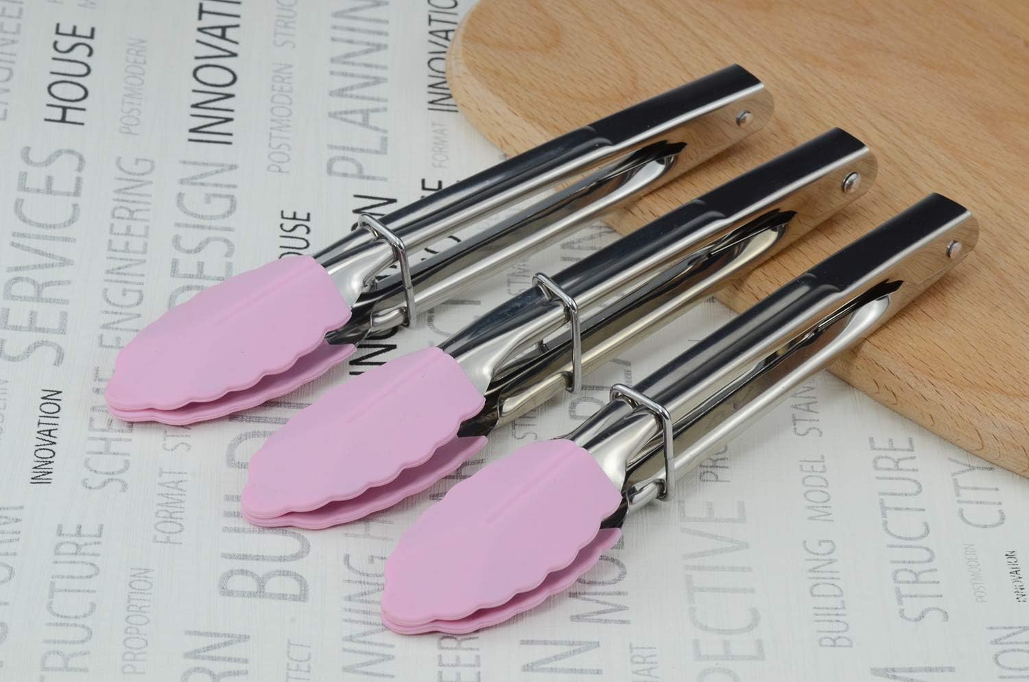 7-Inch Serving Tongs with Silicone Tips Clam Shell Mini Tongs, Set of 3 (Pink)