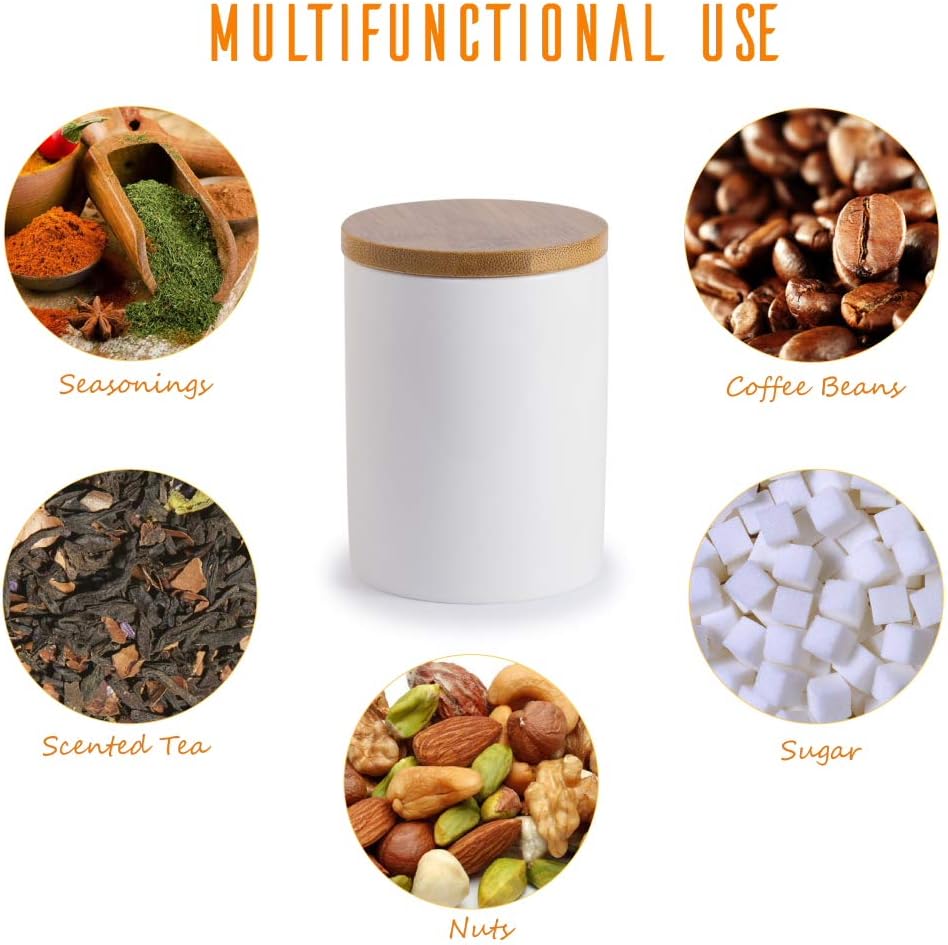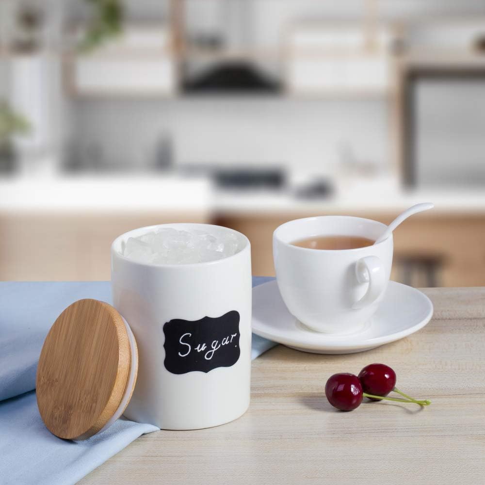 - FUNCTIONAL CANISTERS - The Ceramic Food Canister could be a bowl sering sugar salt flour, a jar serving tea coffe beans, a container holding candies nuts chocolates biscuits, and anything you want to keep dry. With the free chalkboard labels to mark the canisters, would never mix up