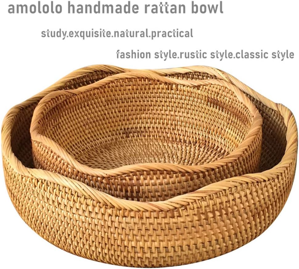 - amololo one kit special looking rattan fruit bowl. 2pieces as a kit, including S and M size. S: Approx. 220mm*70mm(8.7"diameter*2.8"height), M: Approx. 260mm*90mm(10.2" diameter *3.5" height).