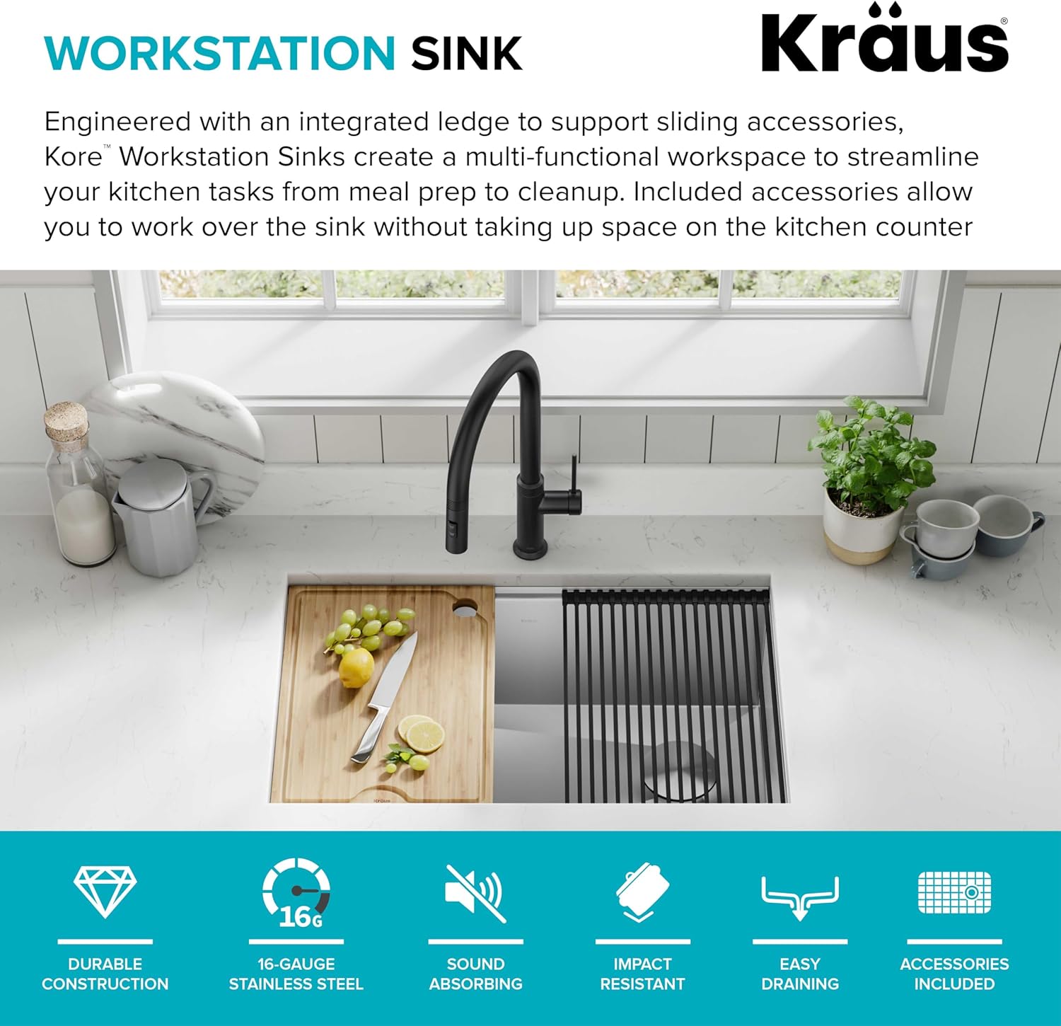 - WORKSTATION SINK with integrated ledge for sliding accessories allows you to work right over the sink while minimizing clutter on the kitchen counter – Chop and slice on the durable bamboo cutting board or dry dishes on the heavy-duty rolling mat