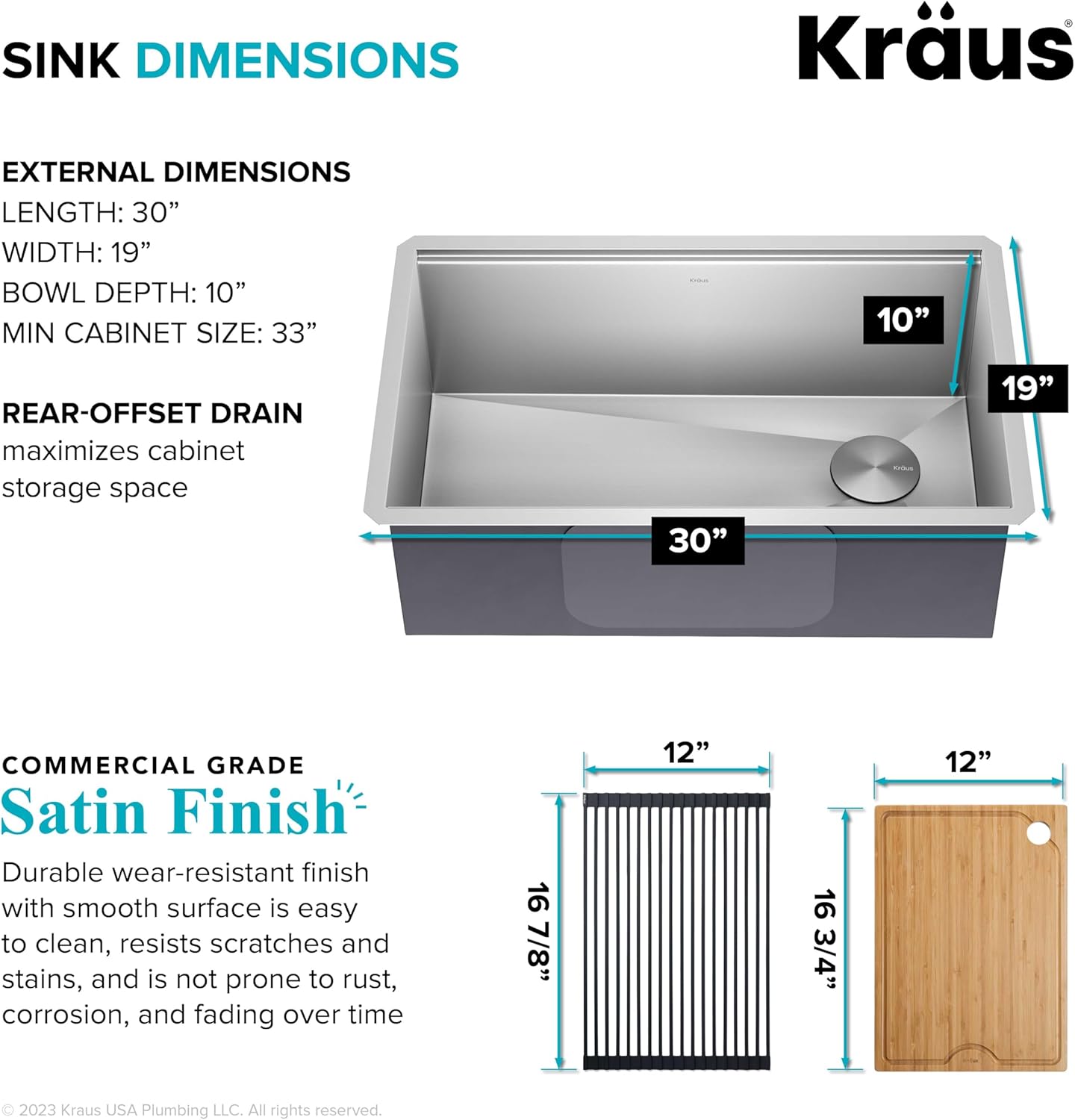 - OUTER SINK DIMENSIONS: 30" L x 19" W x 10 1/2" D – BOWL DIMENSIONS: 26" L x 16" W x 10" D – Minimum cabinet size: 33" – KIT INCLUDES: Sink for kitchen, cutting board, roll-up dish rack, protective bottom grid, drain assembly with cover, hardware, template