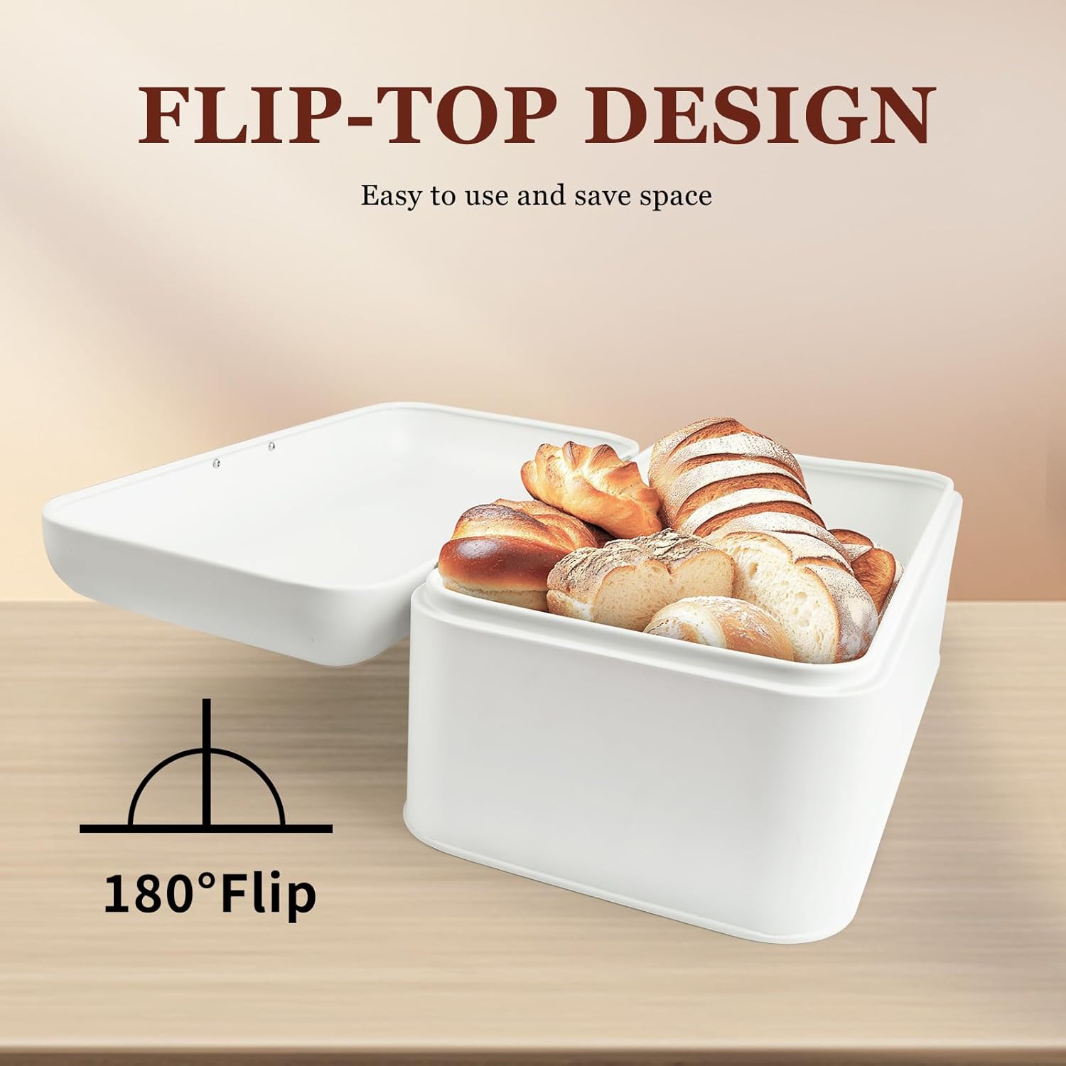 - 【Large Capacity】ENLOY white bread box for kitchen countertop have large capacity for you to holds large loaves of bread and stores cookies, chips, bagels, brownies, muffins, cakes and more. The bread box size of 16.6 x 9 x 7 inches is perfect for your home kitchen or RV.