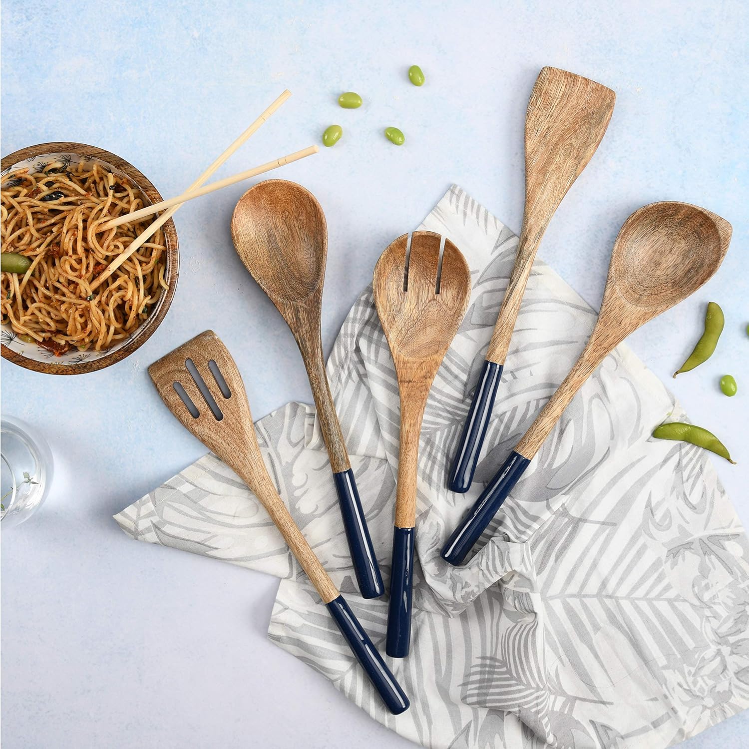 - COMPLEMENTING YOUR KITCHENWARE- The wooden cooking utensils set or wooden spoons for cooking for kitchen essentials are an exquisite collection handicrafted by natural mango wood available in a unique set of 5 including a cooking spoon, wooden spatula or turner, slotted spatula or turner, fork and corner spoon.