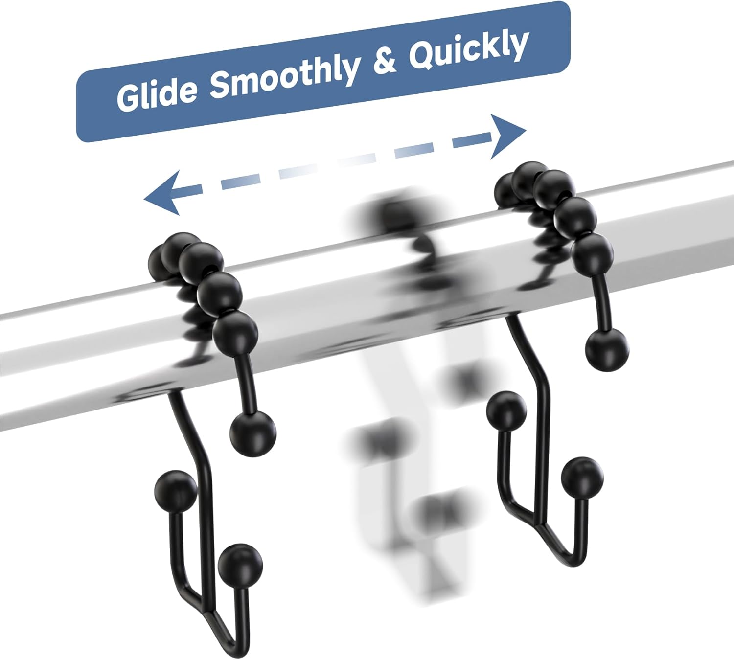 - Double hooks design - The double roller glide shower hooks are strong enough to hold up shower curtain and shower liner.