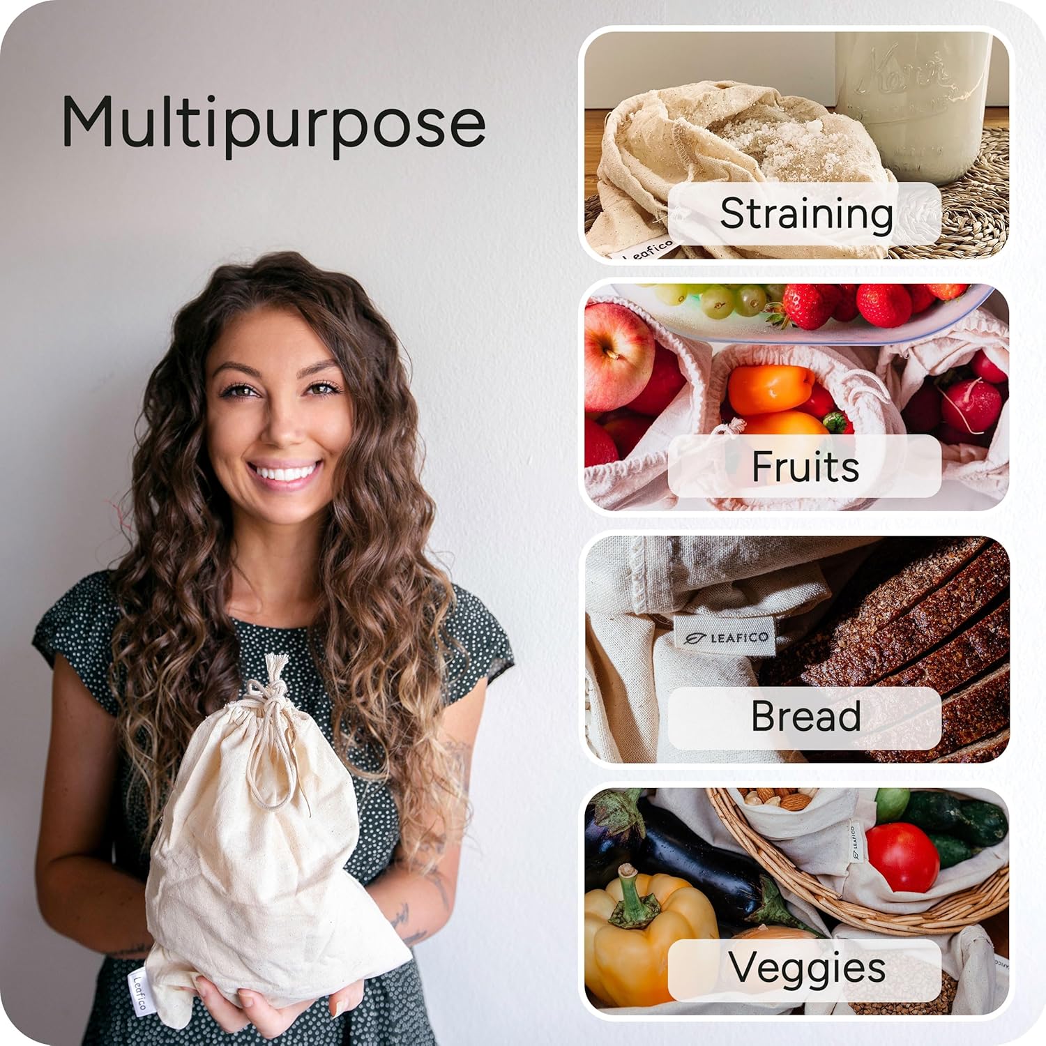 - Reusable and Machine-Washable - Our cloth bags go in the washing machine with no problems and are ready to be reused. Since the bags are 100% cotton better to wash with cold water and air dry. Other bags Shrink too small but Leafico is designed with an Extra inch on all sides and shrink to a listed size