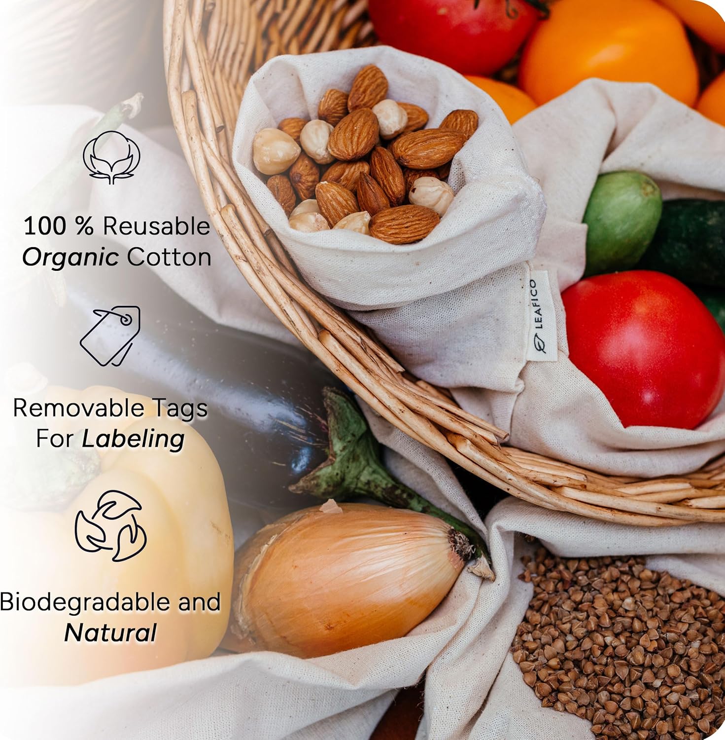 - Eco-Friendly - No more plastic. Use this organic, 100% Biodegradable Cotton/Muslin storage bag with a smooth and delicate fabric, which allows for air circulation. Easy to care for. No toxic chemicals were used while weaving the muslin fabric bags.