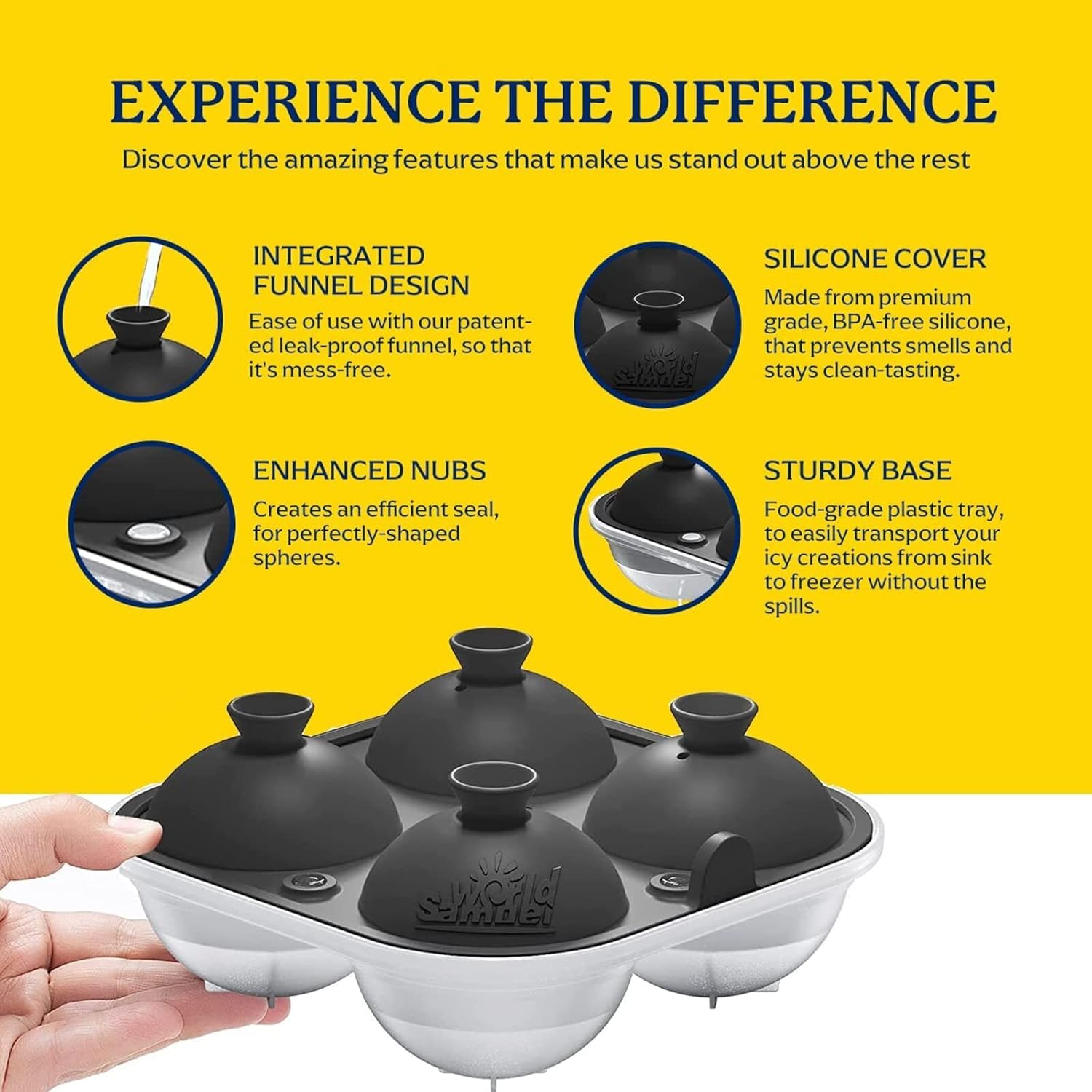 - CRAFTED BY CONNOISSEURS: Samuelworld's range of 2.5-inch ice ball trays are designed with an integrated funnel system, for a more efficient fill that is just so easy to use and also mess-free. You will never need to bother with misplacing funnels for your ice trays ever again. The food-grade plastic tray helps with ease of portability, coupled with the flexibile silicone sphere cover that helps to reduce leakages and achieves an efficient seal for those perfectly round large ice spheres.