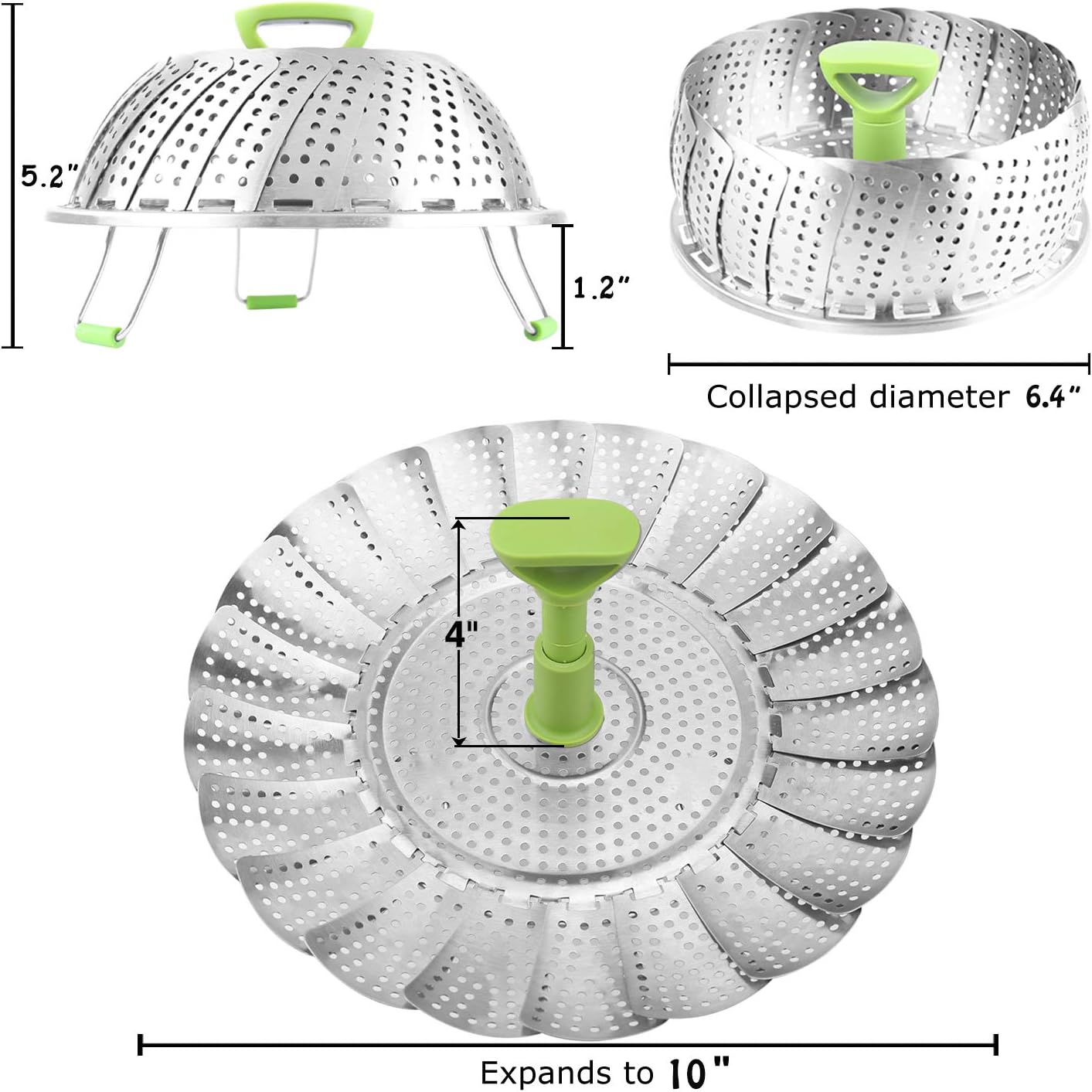 - Expandable and collapsible: Vegetable steamer basket collapsed diameter is 6.4 inches. It expands to 10 inches once petals are stretched out. The "wings" that fold in and out allow the steaming basket fit various pot/pan sizes or pressure cooker, turning any pan into a steamer. This steamer for cooking opens like a water lily and it folds compactly to save storage space