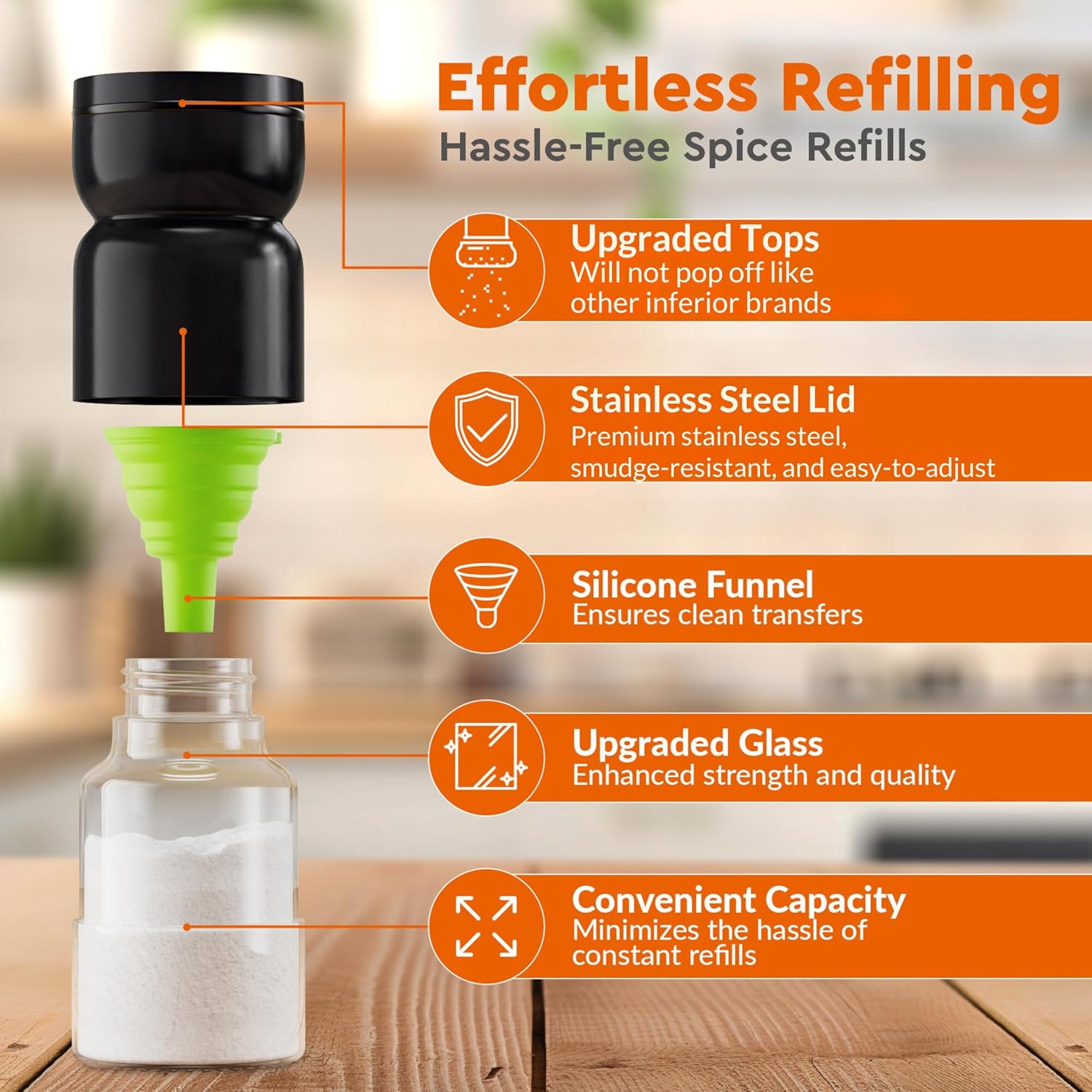 - Easy refilling - Holding 1/2 cup of spices, this set is the perfect size to reduce constant refills without being bulky. The clear glass shows when it's time to refill! Stainless steel top easily screws off a wide opening for easy, mess free refills.