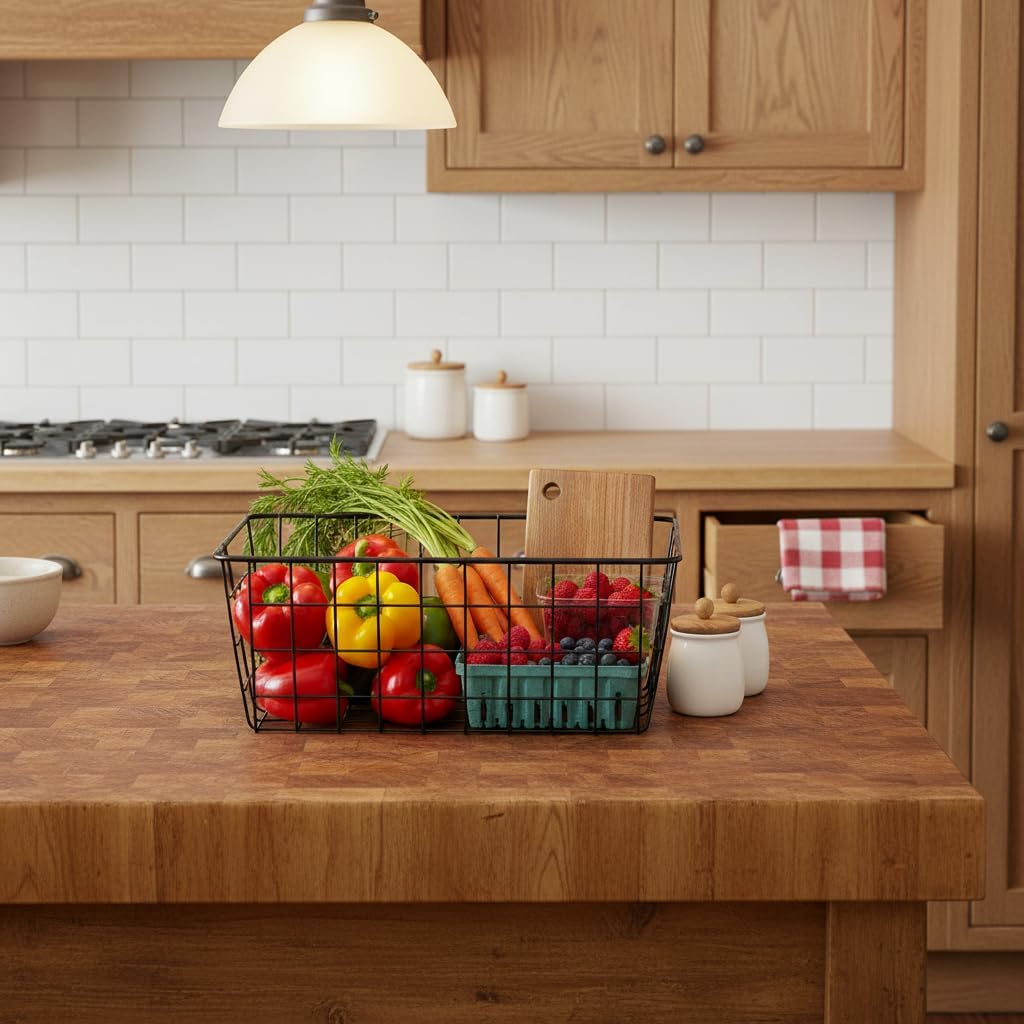 Kitchen Wire Baskets Farmhouse Decor Metal Food Storage Organizer, Household Refrigerator Bin with Built-in Handles for Cabinets,Pantry Set of 4 (Black)