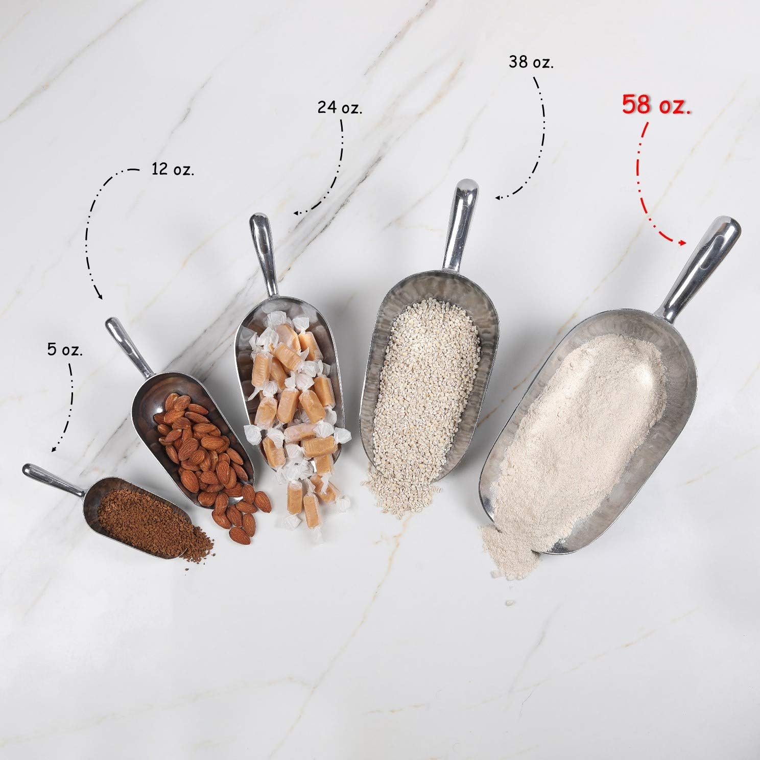 - CAPACITY - deep metal scoops for dry goods to assure a user experience with no spills, no more hassle when you need to scoop ice from ice-making machines an effective solution for holding various kinds of foodstuff!