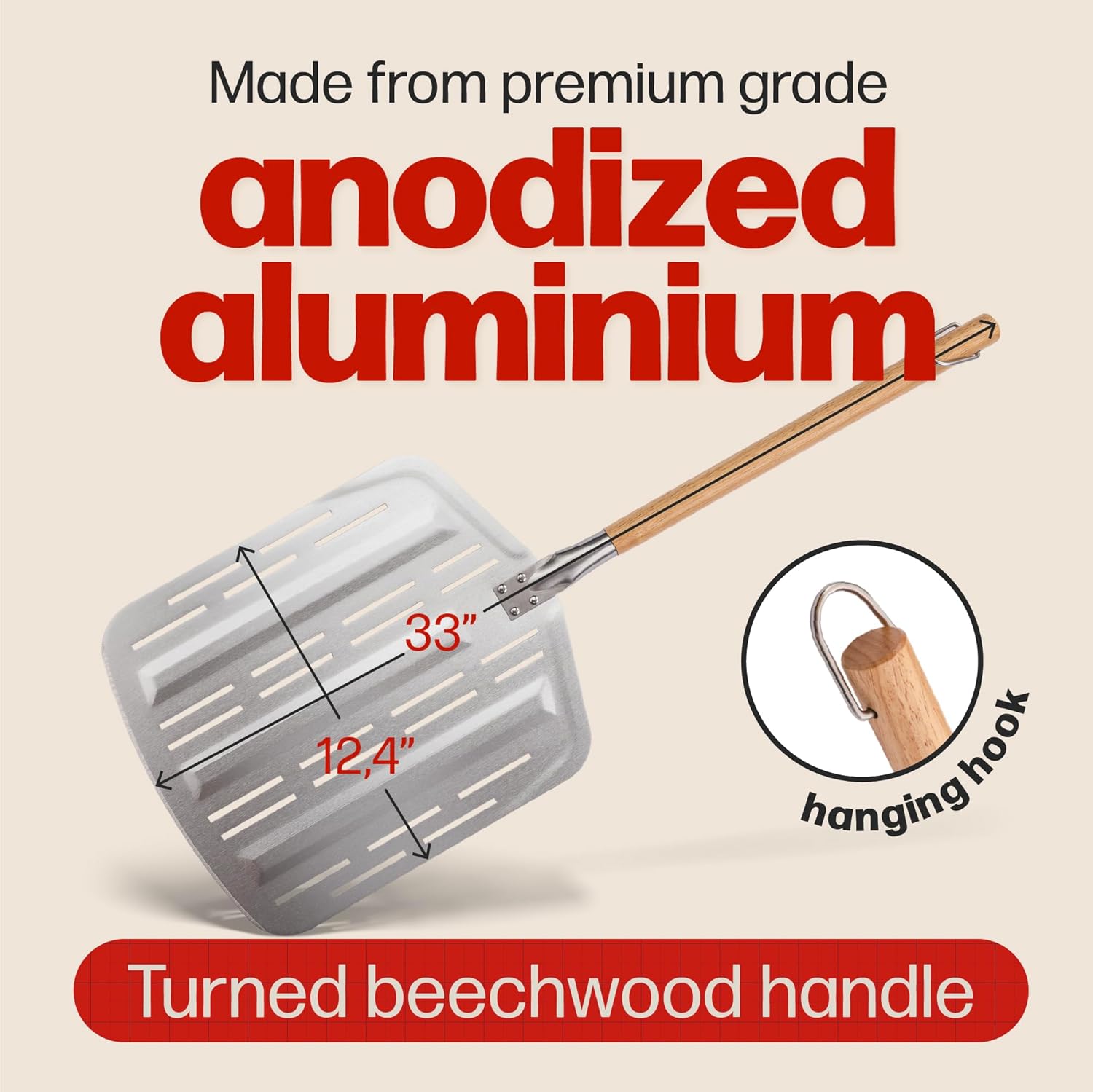 - PREMIUM QUALITY: Made from premium grade Anodised Aluminium, with a turned beechwood handle for comfortable and safe handling. Our pizza peels are made to last, meaning you can launch and retrieve delicious home made pizzas again and again.