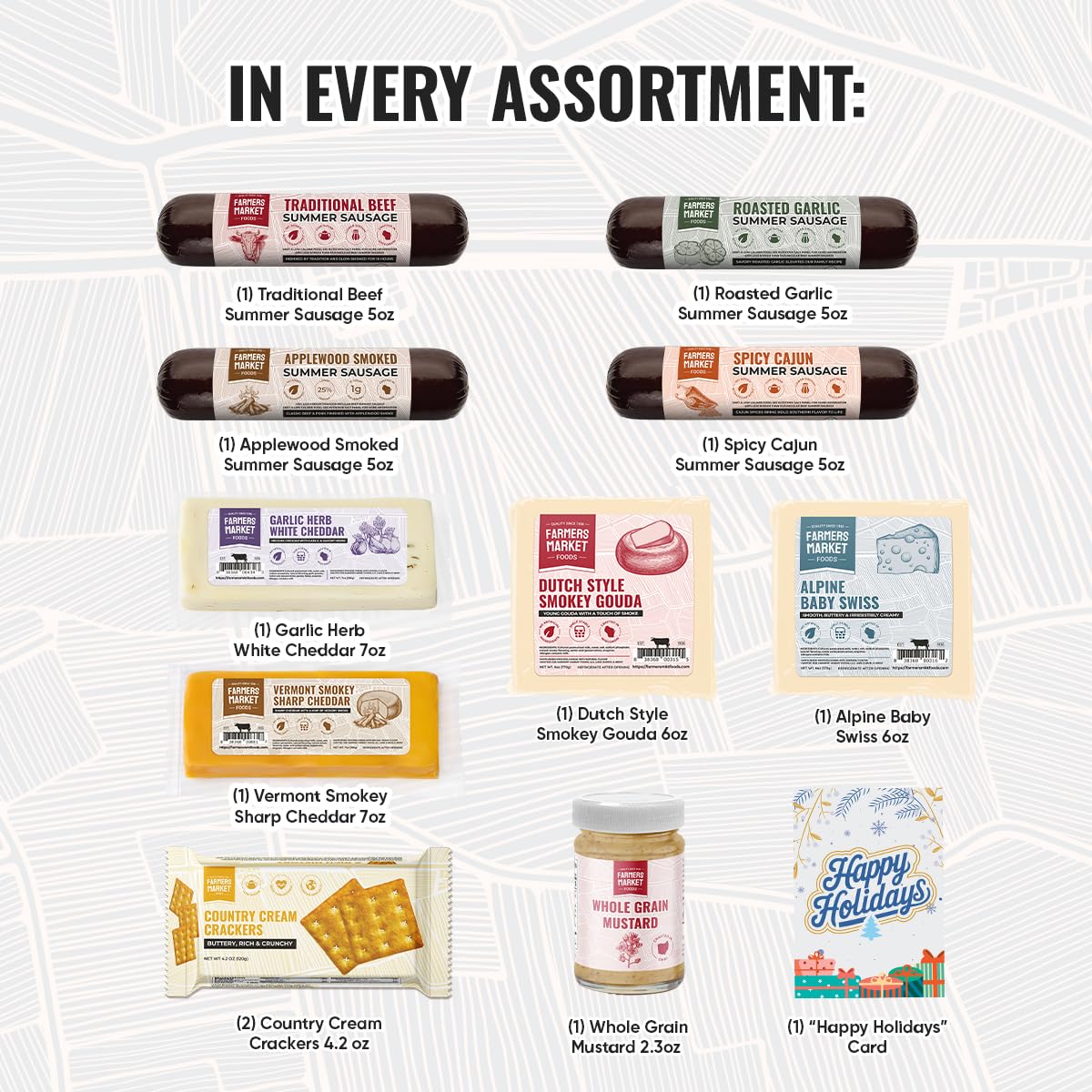 - Ideal for Grazing & Gathering: Includes Traditional Beef, Roasted Garlic, Spicy Cajun, Applewood Smoked sausages; Vermont Smokey Sharp Cheddar, Garlic Herb White Cheddar, Dutch Style Smokey Gouda, Alpine Baby Swiss cheeses; two packs of Country Cream Crackers, Whole Grain Mustard, and a Seasonal Greeting Card.