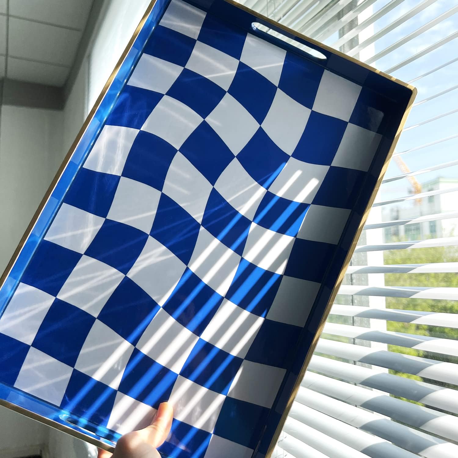 Zosenley Decorative Tray, Marbling Plastic Tray with Handles, Rectangular Vanity Tray and Serving Tray for Bathroom, Kitchen, Ottoman Tray and Coffee Table, 15.6" x 10.2" (Blue and White Checkered)