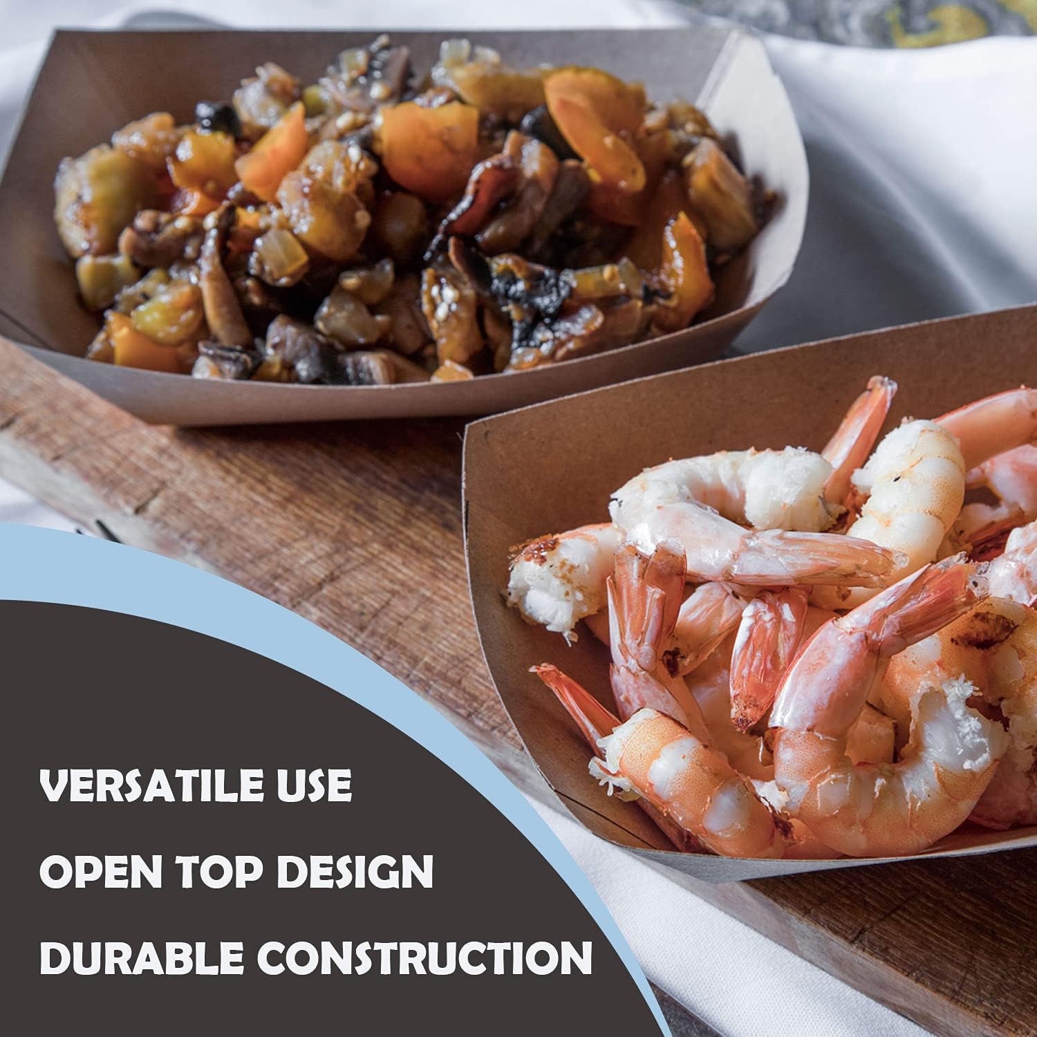 - WIDE USE: These paper food trays are ideal containers serving nacho, fries, popcorn, burgers, taco, bread, barbecue, small cakes, desserts, candies and more. Ideal for food stalls, restaurants, cinemas, shops, supermarkets, Christmas, Halloween, wedding, birthday, event, picnic, party, cafe and so on.