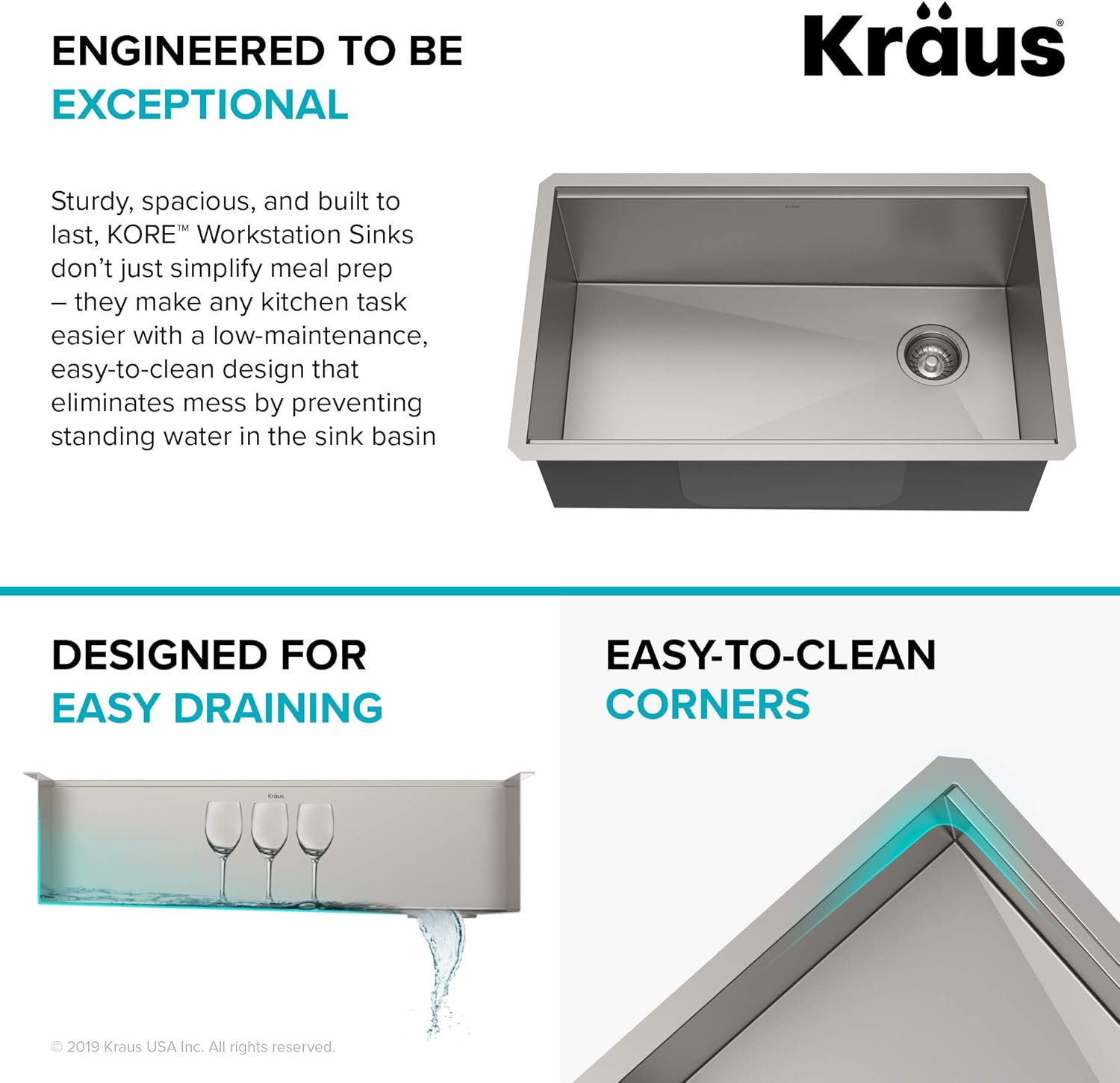 KRAUS Kore Workstation 30-inch Undermount 16 Gauge Stainless Kitchen Sink, Single Bowl Kitchen Sink with 3/4 HP Garbage Disposal, KWU110-30-100-75MB