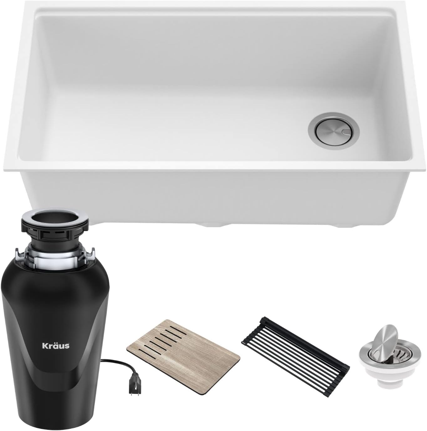 KRAUS Bellucci Workstation 32 in. Undermount Granite Composite Single Bowl Kitchen Sink in White with Accessories with WasteGuard™ Continuous Feed Garbage Disposal, KGUW1-33WH-100-75MB