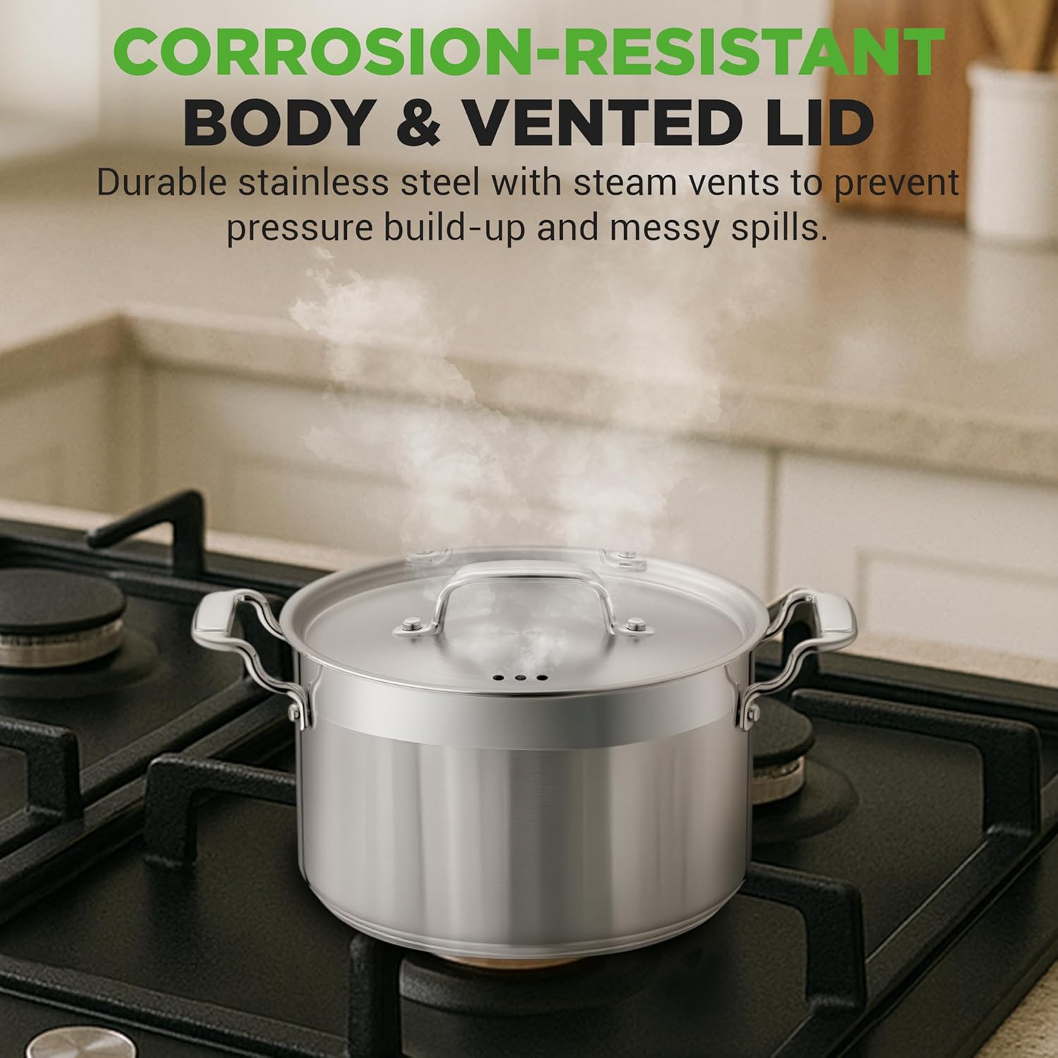 - FOOD-GRADE STAINLESS STEEL:Made of 18/8 non-reactive stainless steel interior which is non-toxic, non-allergic & safe for cooking. Has an impact-bonded base for even heat distribution w/ base thickness of 0.118” & pot dimension of 11.85”x9.33”x6.30”