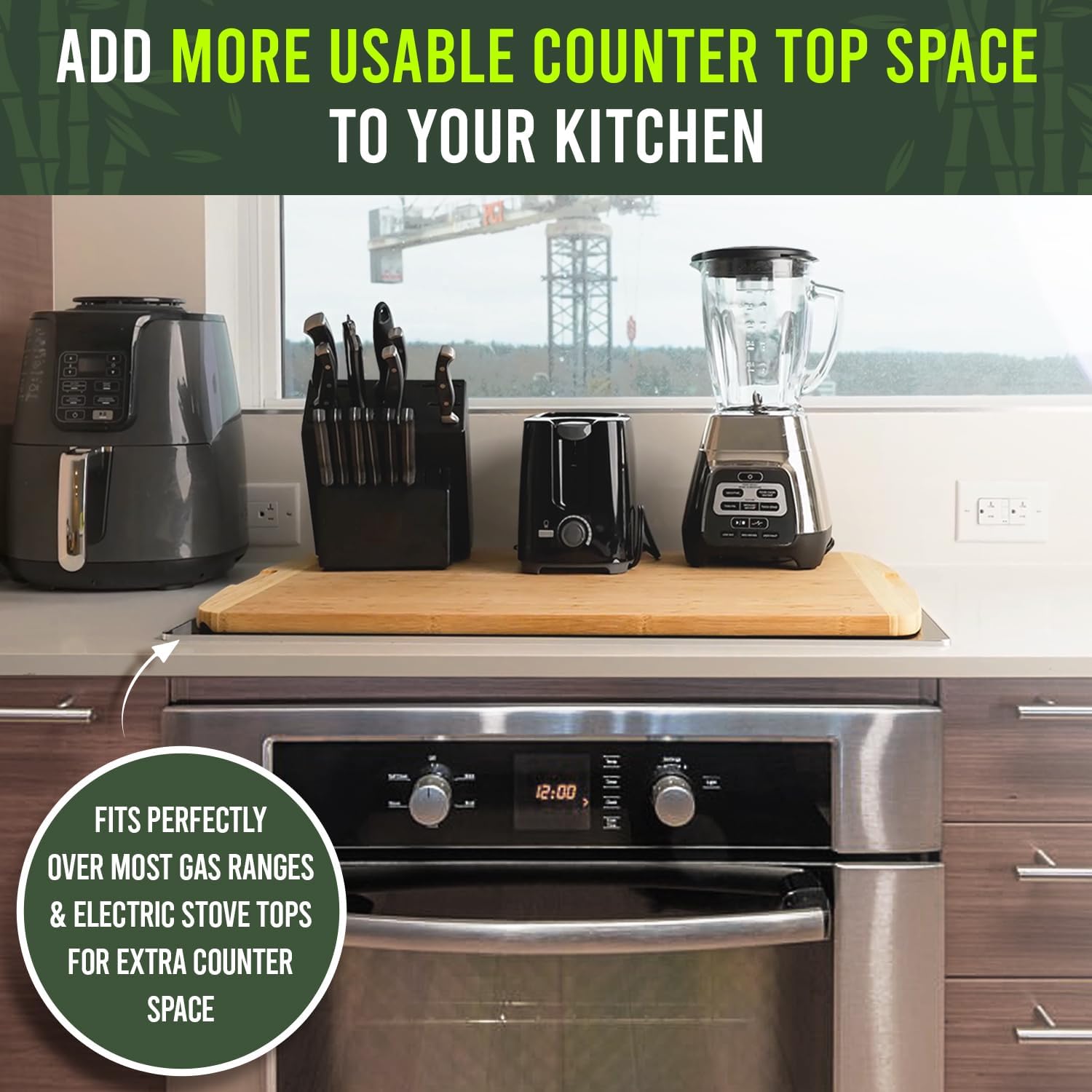 - TRANSFORMS YOUR STOVETOP INTO A CHEF’S WORKSTATION – Instantly reclaim precious counter space by covering your stovetop with this gorgeous slab of bamboo. More room. More freedom. More joy in every meal you prepare.