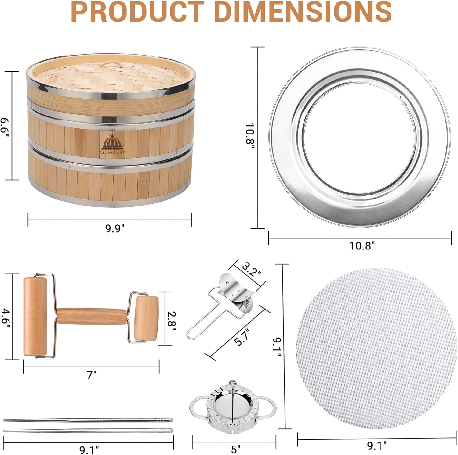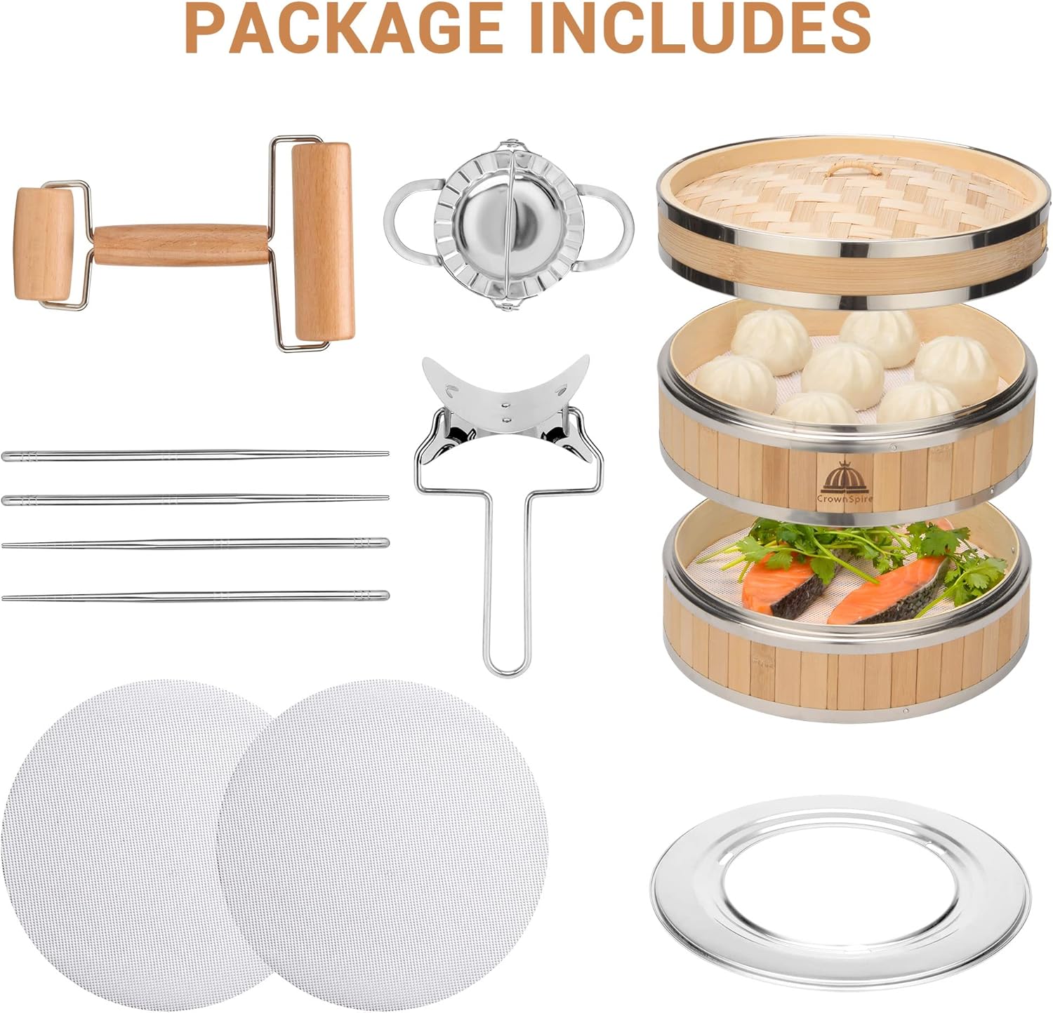 - Complete Set: Steam basket comes with 2 bamboo steamer baskets, stainless steel adapter ring (fits 8"-11" pots and pans), 1 dumpling mold, 1 dumpling skin cutter, 4 stainless steel chopsticks, and 2 silicone pads