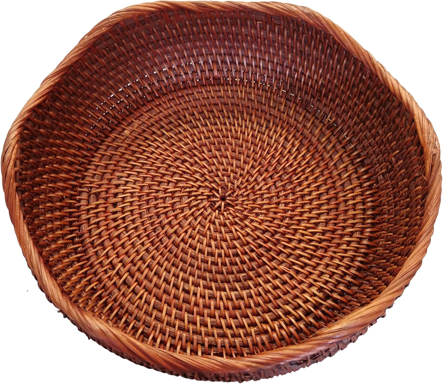 Handmade Rattan Round Fruit Basket Food Storage Bowls Kitchen Organizer Snack Serving Bowl 10 Inch Wavy Edge Circle Tray Basket with 3” Deep Wall, Dark Brown Décor Display Tray Bowl, M
