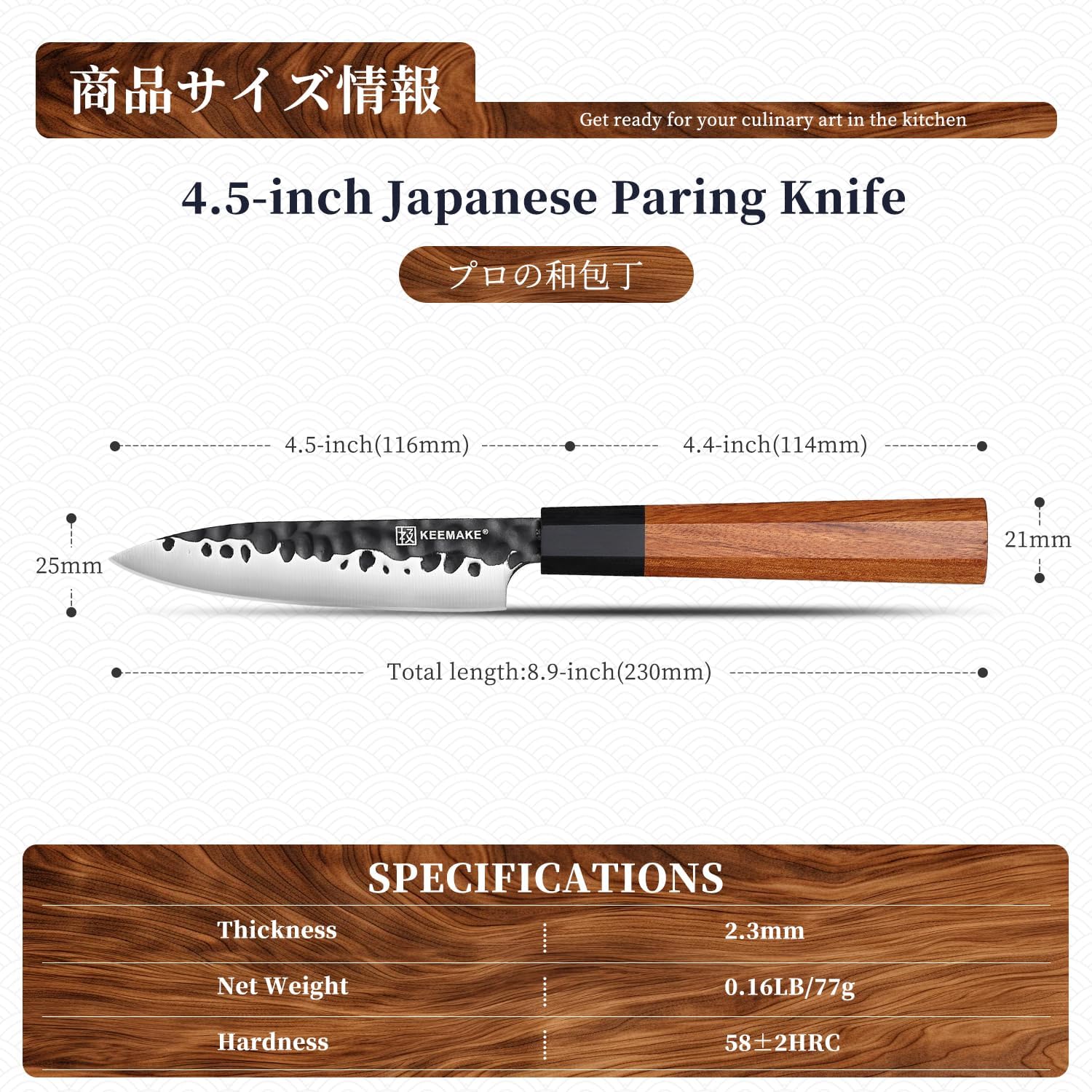- 【PREMIUM MATERIAL】KEEMAKE KIKU series Japanese paring knife is crafted out of premium Japanese 440C high carbon stainless steel with 58+ HRC and have the effect of increasing strength (sharpness and abrasion resistance) and sticky (hard to chip). Recommend Japanese 440c steel Japanese paring knife because of their characteristics: ease of re-sharpening, good durability and rust resistance, and edge retention
