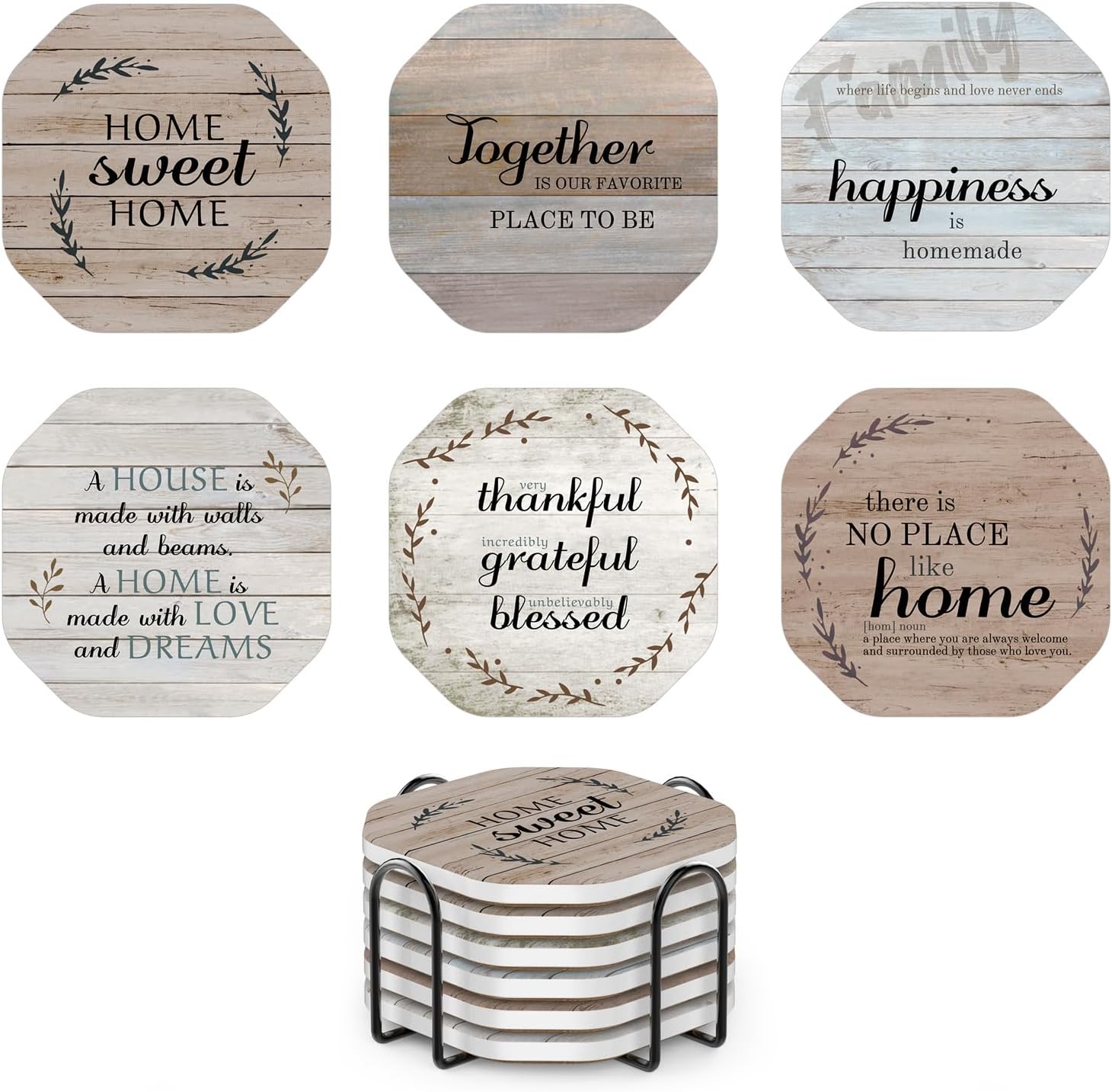 - OVERVIEW - 6-piece beautiful coaster set - 4" size, professionally printed on high-quality super absorbent ceramic stone with durable natural cork backing. Comes with a premium iron holder that can neatly stack your coasters