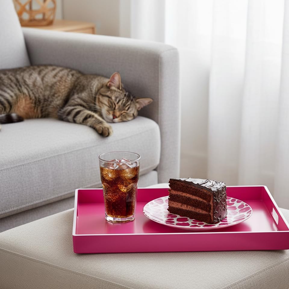 Zosenley Decorative Tray, Rectangular Plastic Tray with Handles, Modern Vanity Tray and Serving Tray for Bathroom, Kitchen, Ottoman and Coffee Table, 15.6” x 10.2” (White Border Rose red)