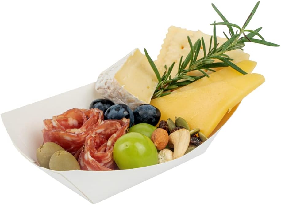 - STYLISH DESIGN: Serve your treats with style! Featuring a minimalistic white finish, these paper trays are great for displaying meatballs, onion rings, cookies, and other bite-sized foods.