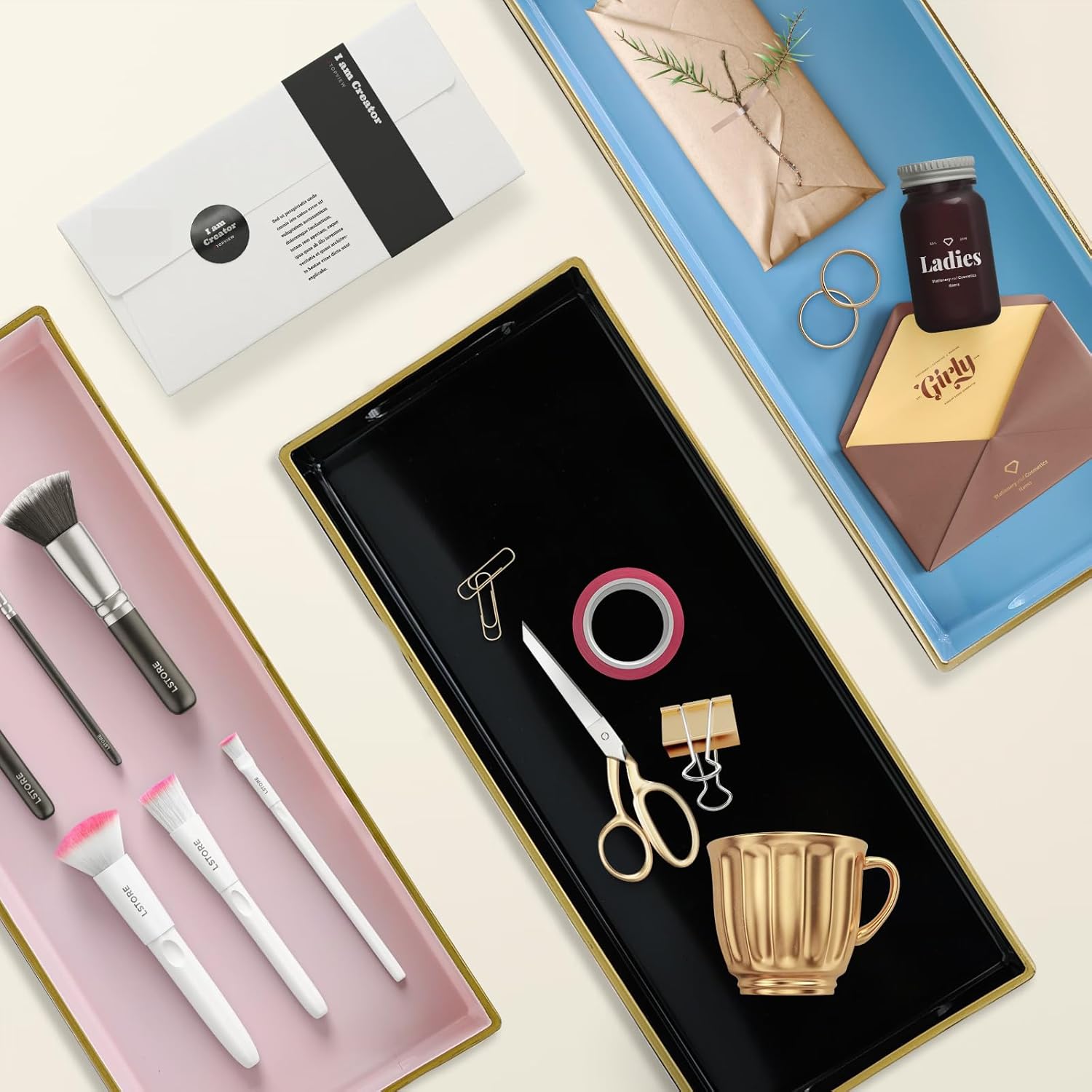 - Save Space: This vanity tray size with 13.7"x 5.9" x 1.37" and may be conveniently placed on the toilet tank, bathroom, vanity countertop, or bedside table due to its small size. Gather jewelry, candles, rings, earrings and place on the tray and keeps your table clean and tidy.