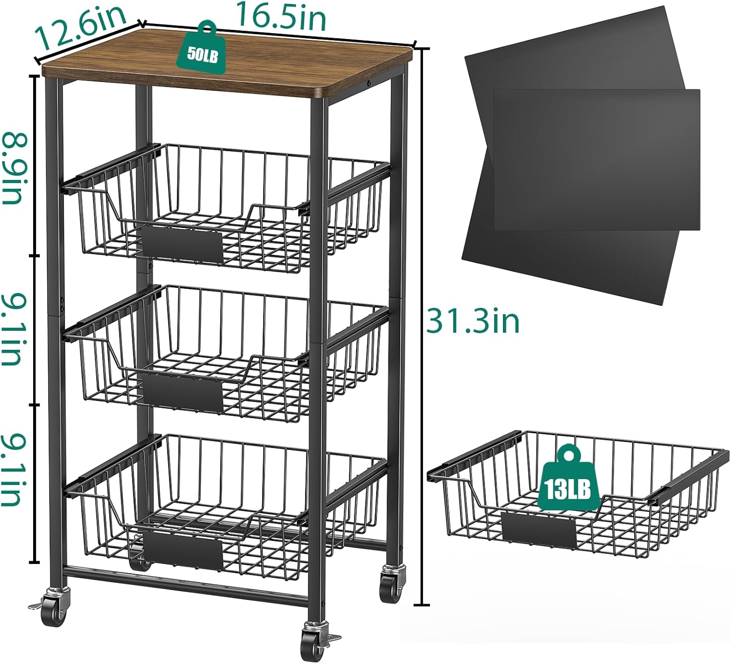 - Versatile Kitchen Storage Cart: Designed with 1 layer of wood look top and 3 pull-out baskets storage, 4-tier vegetable rack for kitchen can be used as a kitchen organizer, fruit vegetable basket, produce basket, toy storage bins, can dispensers, toiletries, office, dog supplies cart.
