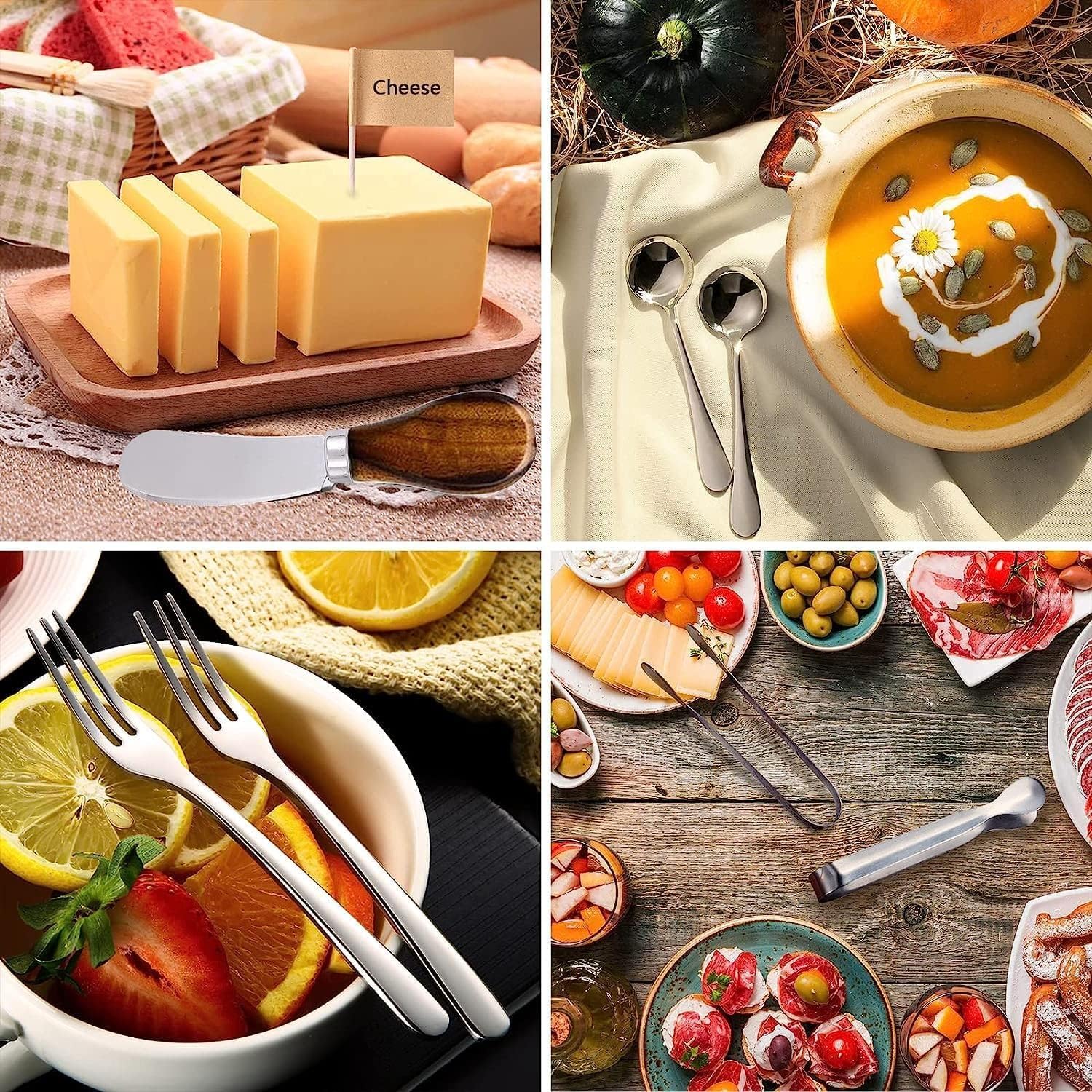 - 【Complete Charcuterie Utensils Set】The butter knife features seamless integrated technology for a smooth, safe, and comfortable grip. The mini serving tongs, crafted from premium 304 stainless steel, are sturdy and easy to handle. The mini spork is perfect for both children and adults. Use the mini dipping bowls for condiments, jams, honey, and desserts. Plus, toothpick flags serve as cheese and butter labels for easy identification!