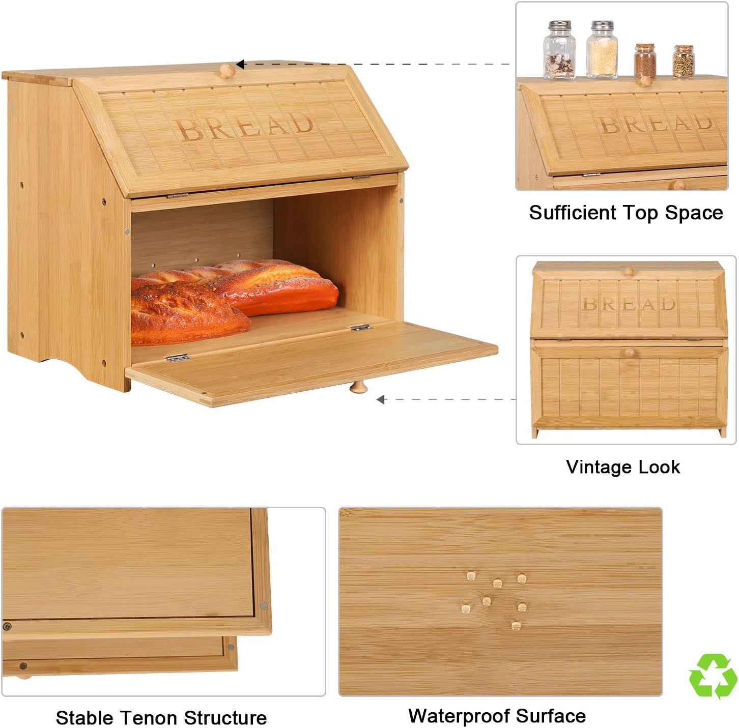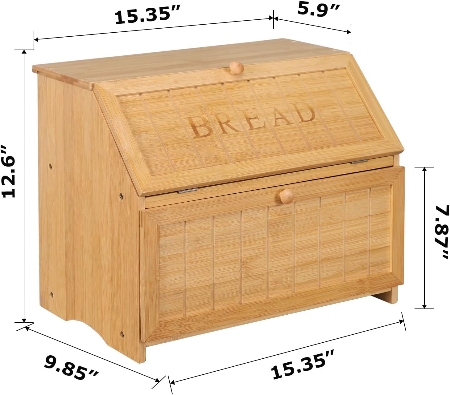 HOMEKOKO Vintage Double Layer Large Bread Box for Kitchen Counter, Retro Design Wooden Large Capacity Bread Storage Bin (Natural Bamboo)