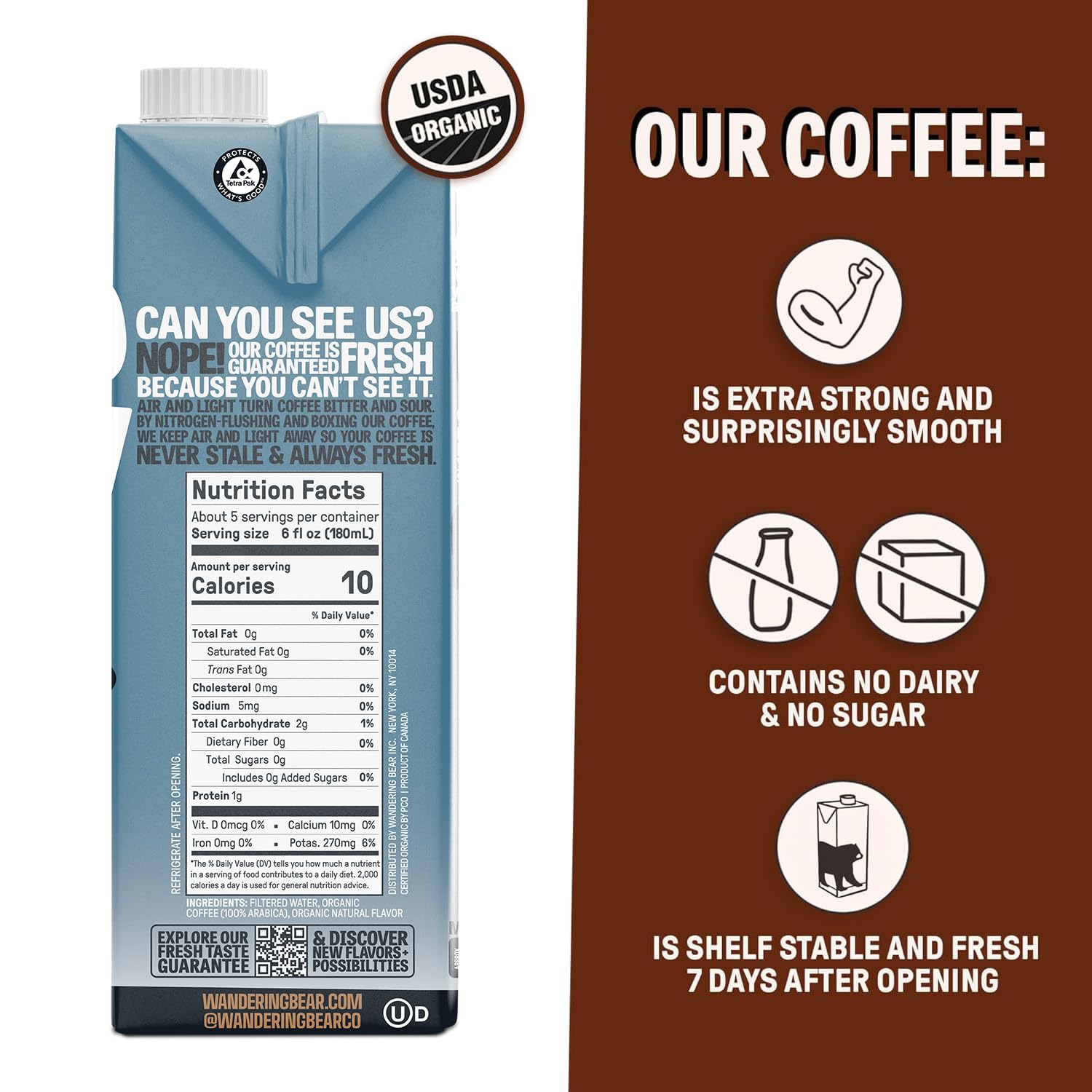 Wandering Bear Organic Vanilla Cold Brew Coffee - Extra Strong, Bold, Smooth, Unsweetened, Shelf-Stable, Ready to Drink, Gluten Free, & Vegan Iced Cold Brewed Coffee Drink - 32 fl oz, 6 pack