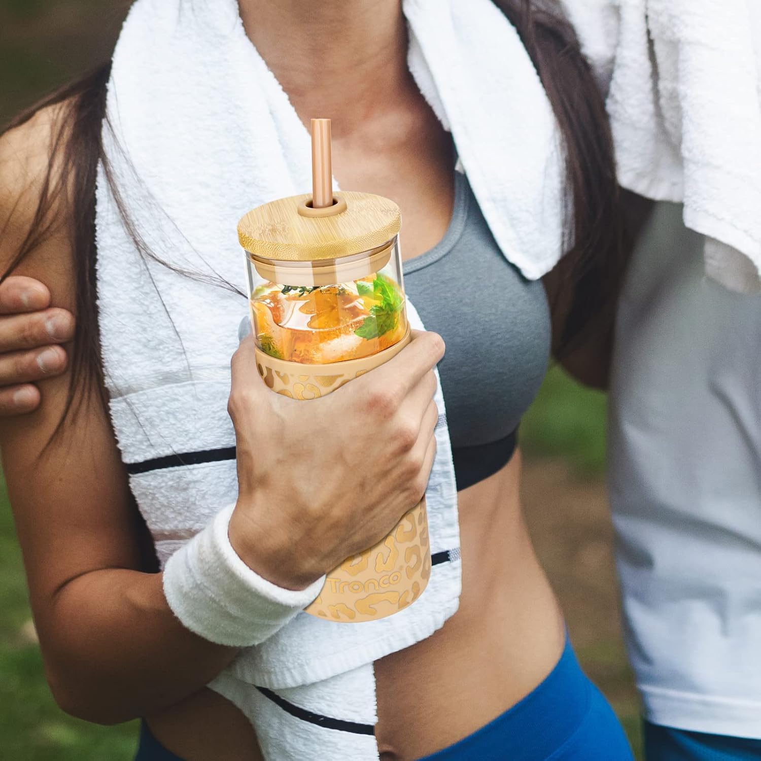 Tronco 20 oz Glass Tumbler with Lid and Straw, Iced Coffee Cup and Smoothie Cup with Bamboo Lids & Protective Silicone Sleeve, Dishwasher Safe, BPA-Free, Glass Cup 1 Pack