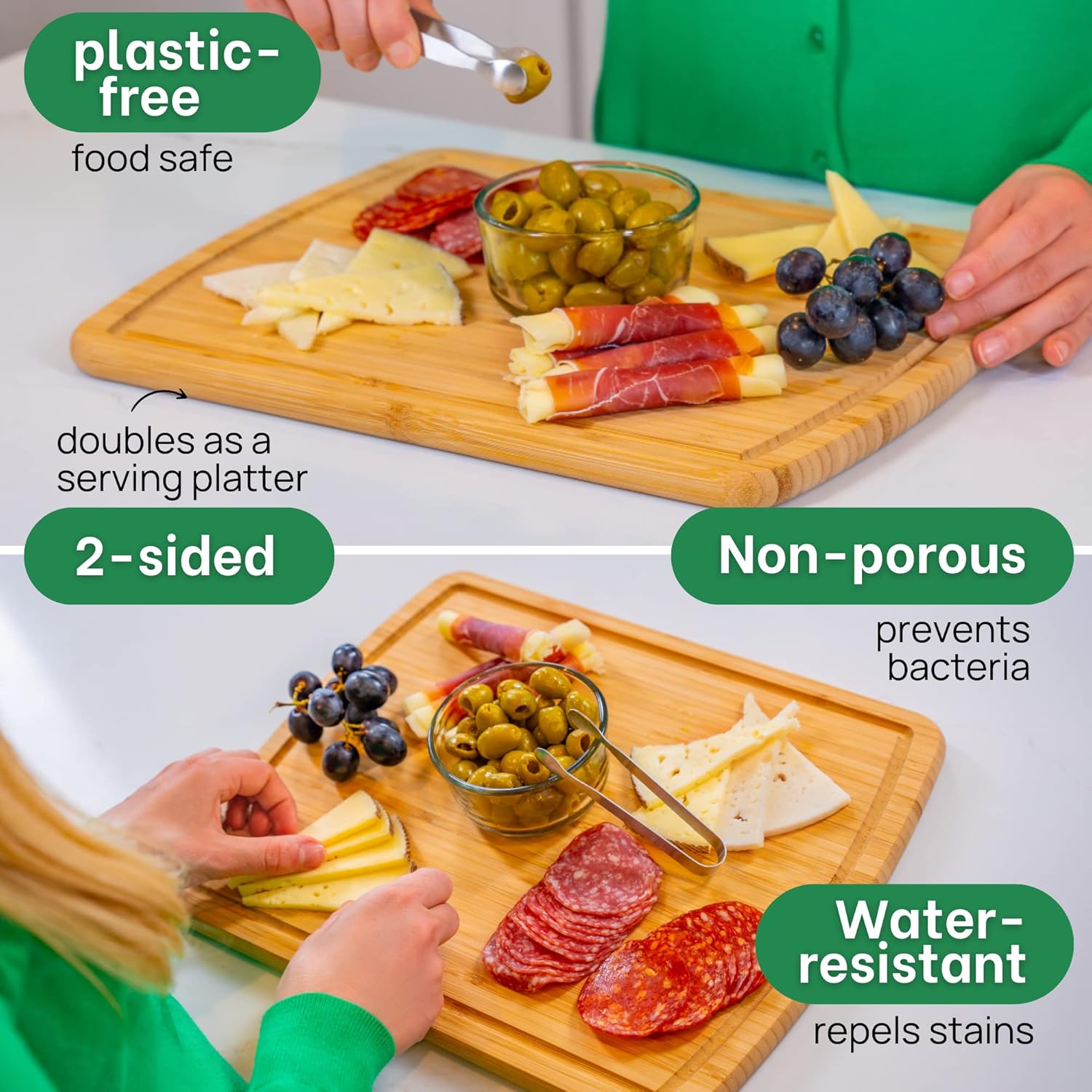 - ENJOY COOKING WITH A SAFER, SMARTER DESIGN - Bamboo's natural properties make these butcher block carving boards a must-have kitchen companion. They’re great for chopping veggies and slicing raw and cooked foods. Easy to care for and clean, this wood cutting board preserves your knife edge longer and is easy to carry safely from kitchen to table. The deep juice grooves even capture juices that you can transform into homemade glazes & gravies. Perfect for health-conscious familie