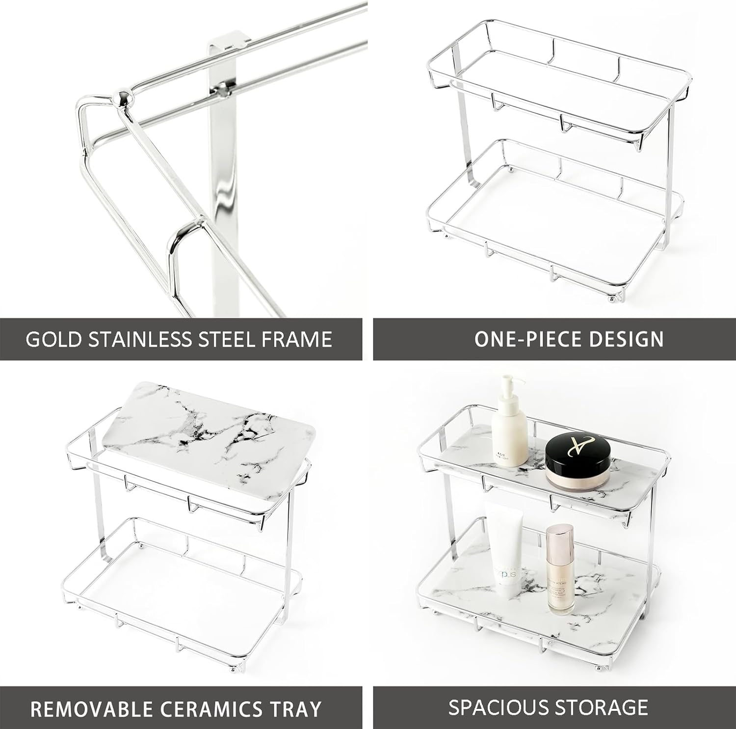 - EASY TO CLEAN: With a sturdy stainless steel frame that can prevent corrosion in wet places and removable ceramic trays with a luxurious marble pattern, this dresser top stand is both functional and easy to clean.