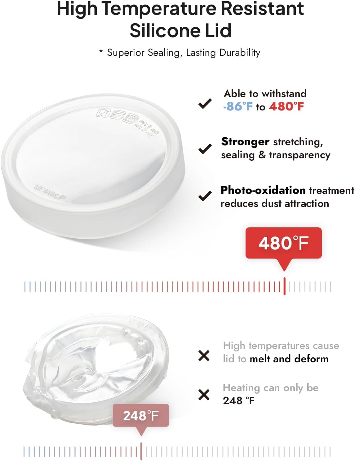 - Upgraded Silicone Leak Proof Lid:This leak-proof lid is made of high tensile silicone,compared with ordinary silicone, this upgraded silicone has stronger stretching force, better sealing, higher transparency and heat resistance. The longer edges cover the ramekin better and won't pop off easily. Useful in the fridge or in a lunch box on the go