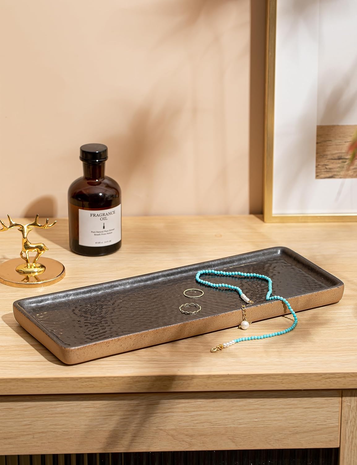 - Countertop tray with a sheer Black glaze, and the natural clay reveals itself around the rim and in the indentations for a warm, modern look. Ideal for corralling toiletries, candles, and cosmetics, put bathroom trays for counter or a perfume holder organizer will be part of your exclusive accessories collection. Even holds everything from keys and coins to jewelry and collectibles. Our table trays top off your space with multi-functional style and versatile potential.