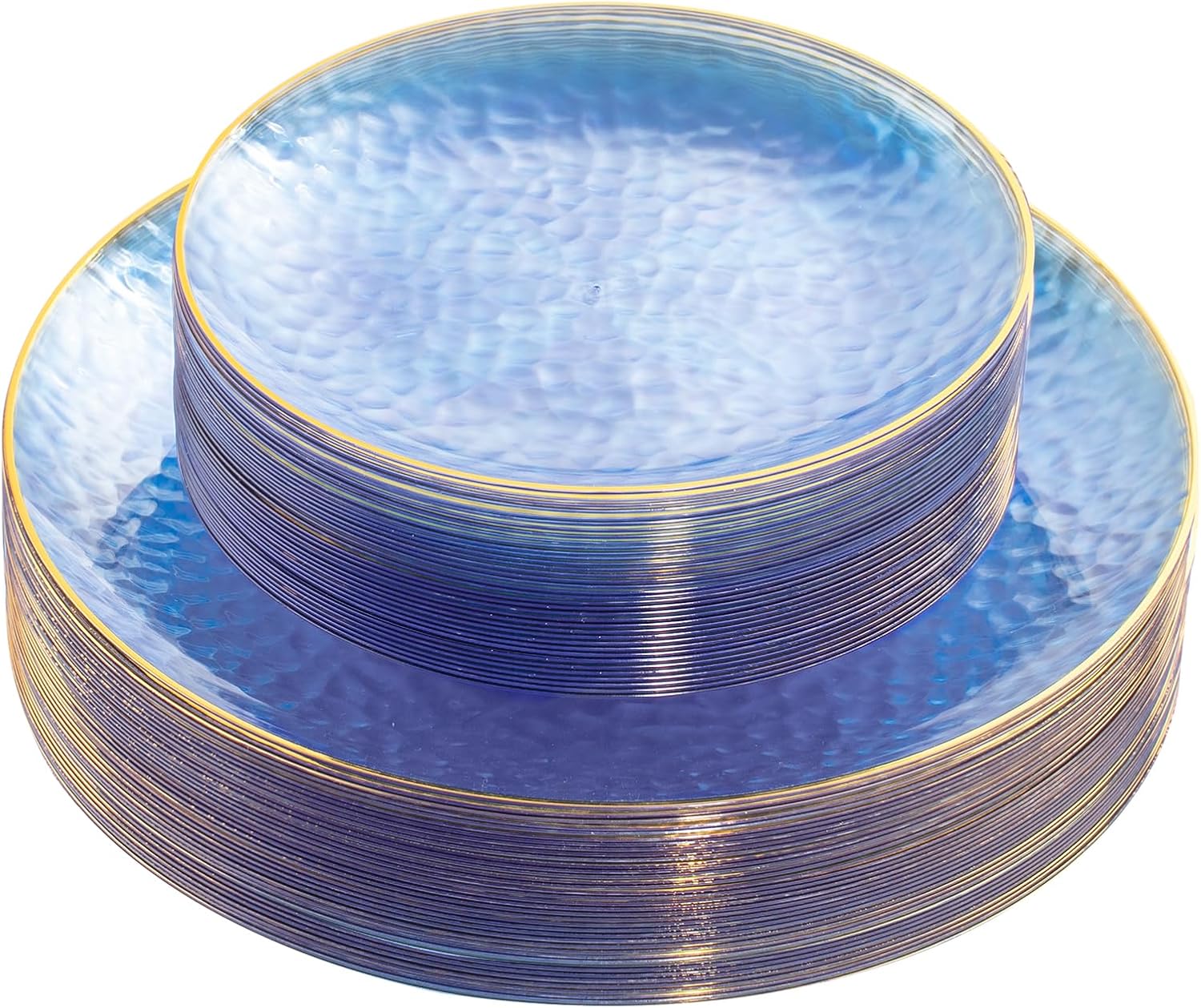 Rubtlamp 60Pcs Clear Blue Plastic Plates, Hammered Blue Plates, Clear Fancy Disposable Plates With Gold Rim Include 30 Dessert Plates, 30 Dinner Plates for Party