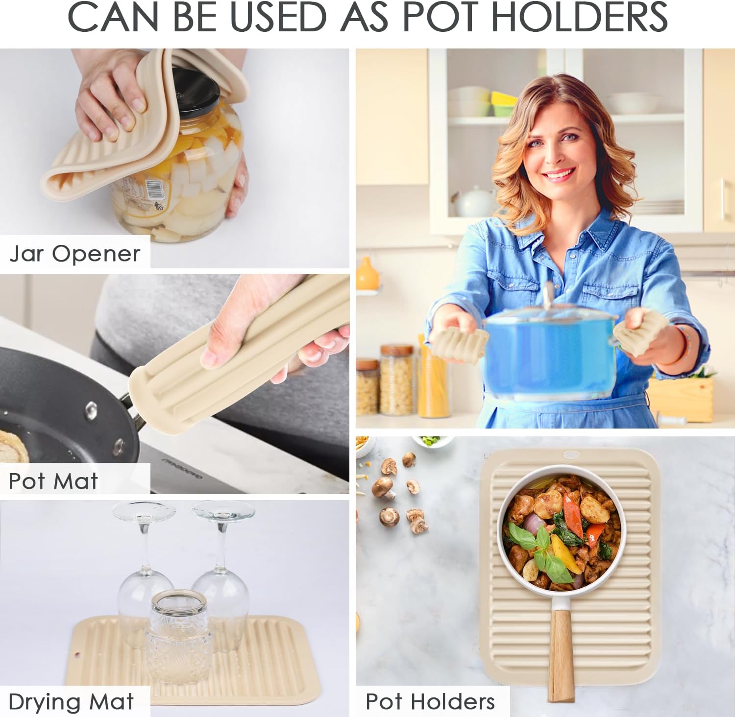 - 【EASY TO CLEAN & STORE】: The beige silicone pot holders for kitchen are easy to clean, wipeable, and dishwasher safe. Almost everything can be easily washed off from surfaces and dry quickly. Roll up or hang it on a hook; save valued kitchen space!