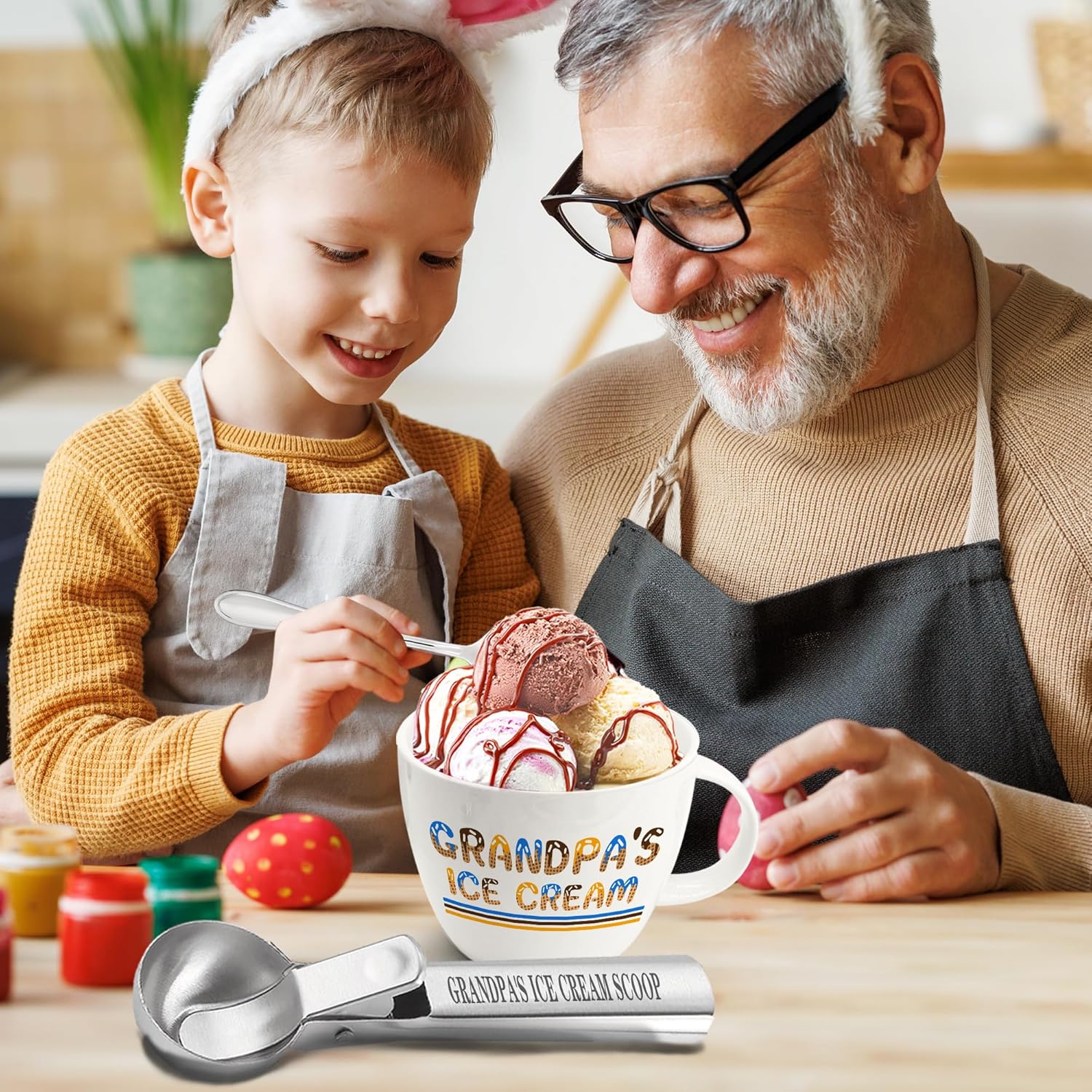 - PERFECT GRANDPA GIFTS IDEA - Exclusive fathers day gift for grandpa, the ice cream bowl is designed with waffle cone and colorful ice cream, printed with the words "Grandpa's Ice Cream", it is an exclusive ice cream bowl for dad, also the ice cream scoop and spoon are printed with the words "Grandpa's Ice Cream". An exclusive and unique gift for grandpa to enjoy pleasure while eating ice cream and also an exclusive happy time with kids.