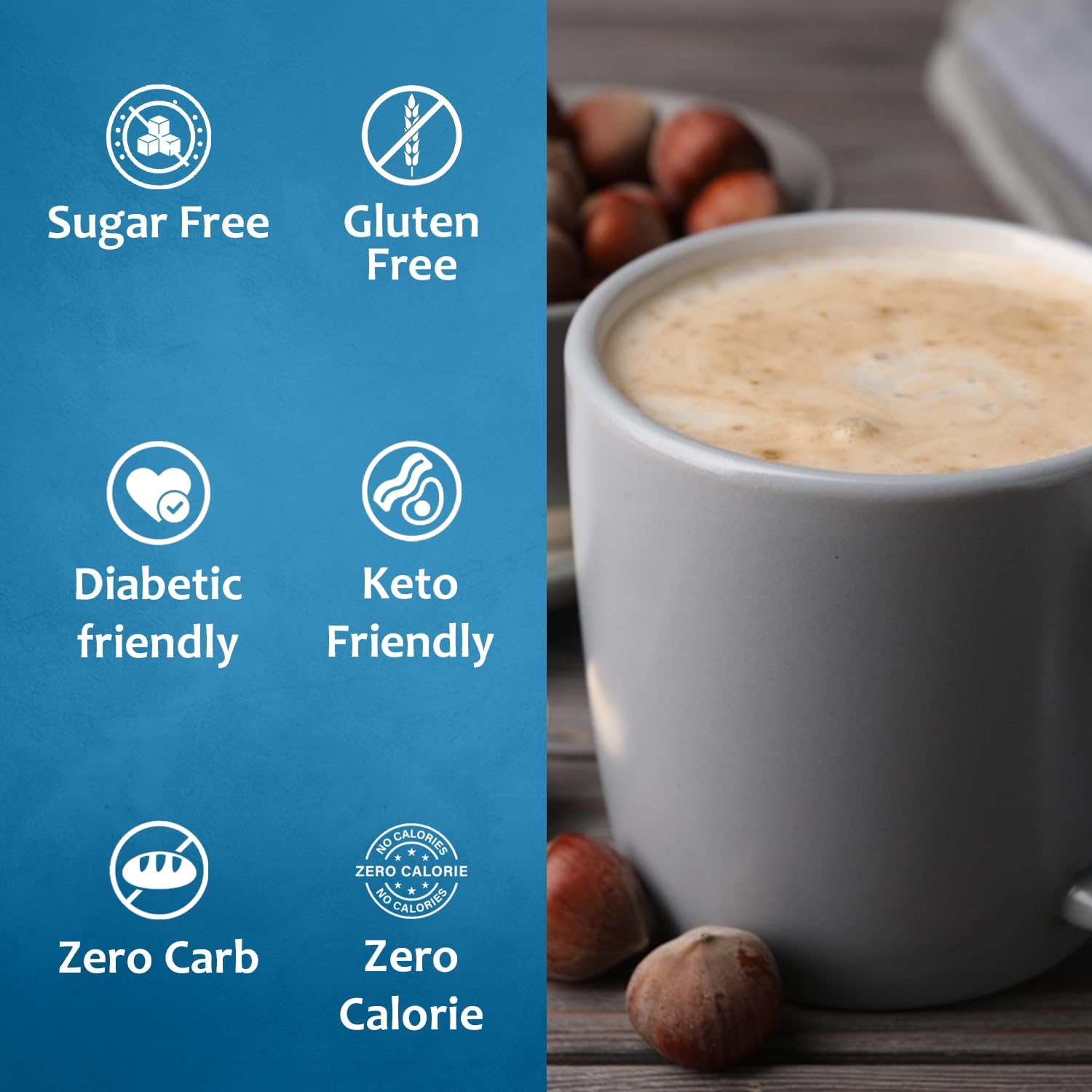 - Sugar-Free Hazelnut Syrup: Experience the homely essence of hazelnuts without the extra calories. Our Sugar-Free Hazelnut Syrup offers the same delicious richness in a guilt-free version.