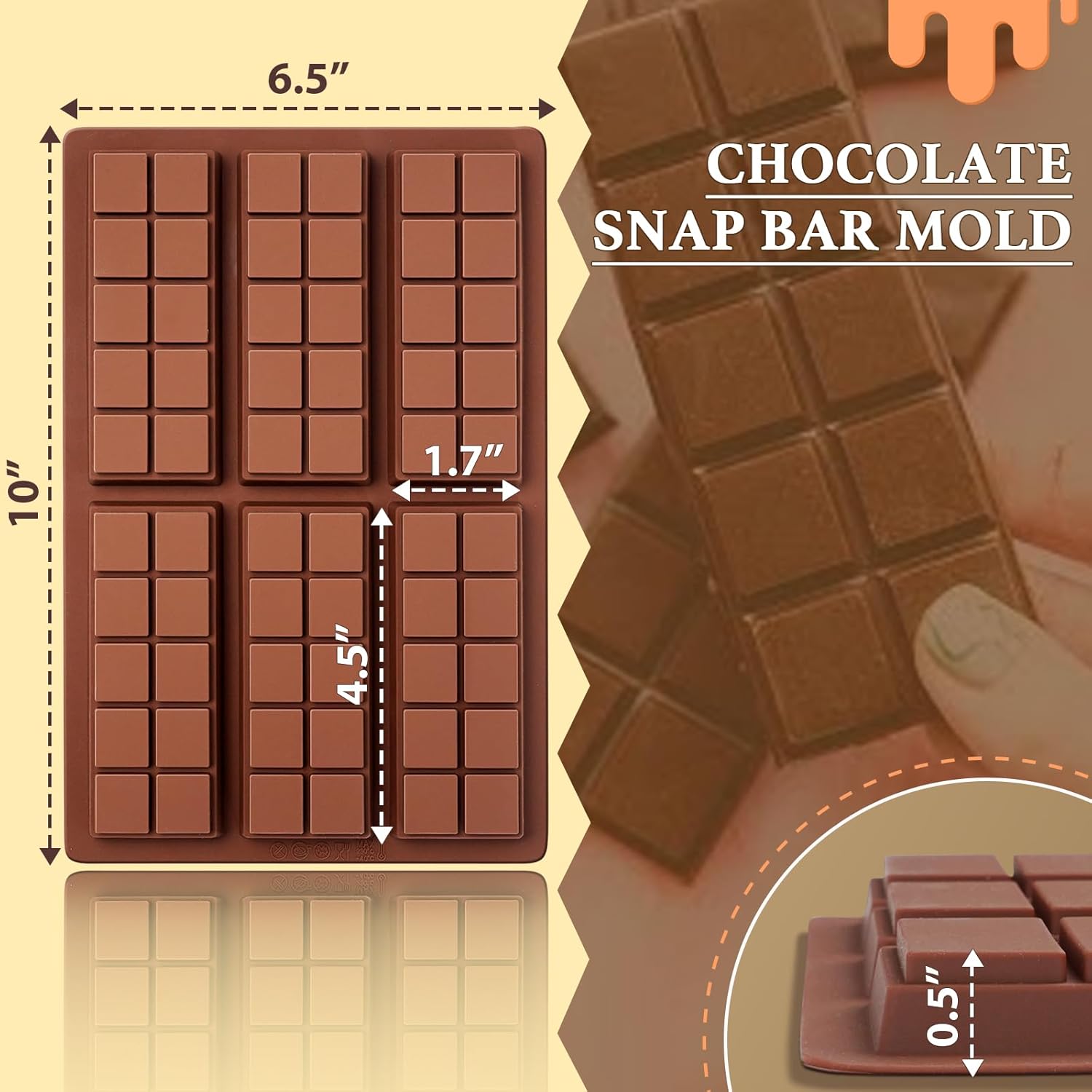 - Ideal Product Size: Our chocolate mold measures 10 x 6.5 x 0.5 inches, one mold can make 6 standard-size chocolates, and each finished product measures 4.5 x 1.7 x 0.5 inches, a convenient size to carry around
