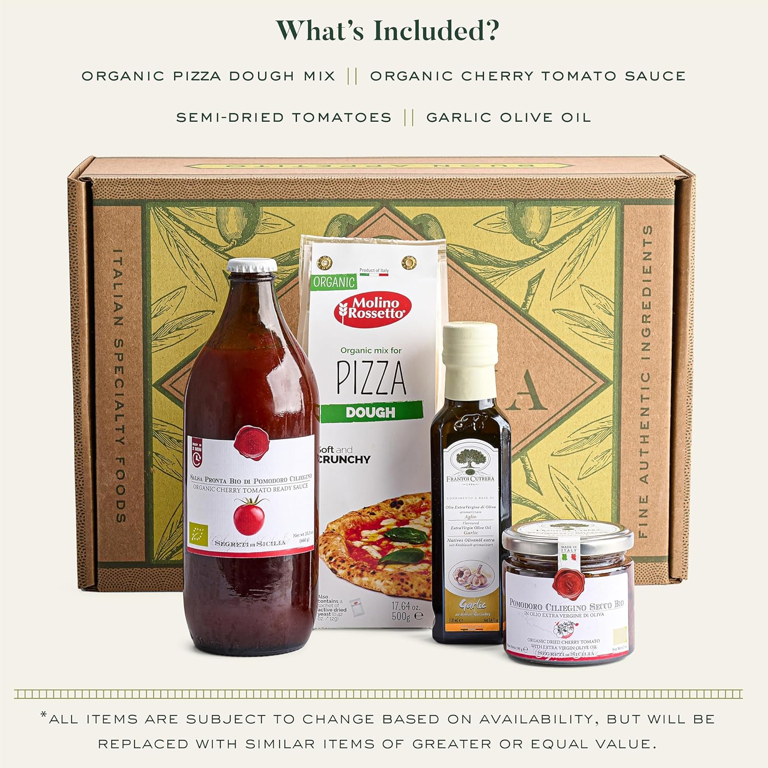 - Gourmet Gift Basket - Our Organic Pizza Kit is perfect for pizza lovers and includes the gourmet ingredients needed to make pizza at home a success. Molino Rossetto Organic Pizza Dough Mix and Frantoi Cutrera Garlic EVOO, Semi Dried Cherry Tomatoes, and Organic Tomato Sauce are all included to add delicious flavor to your personal pizza creation