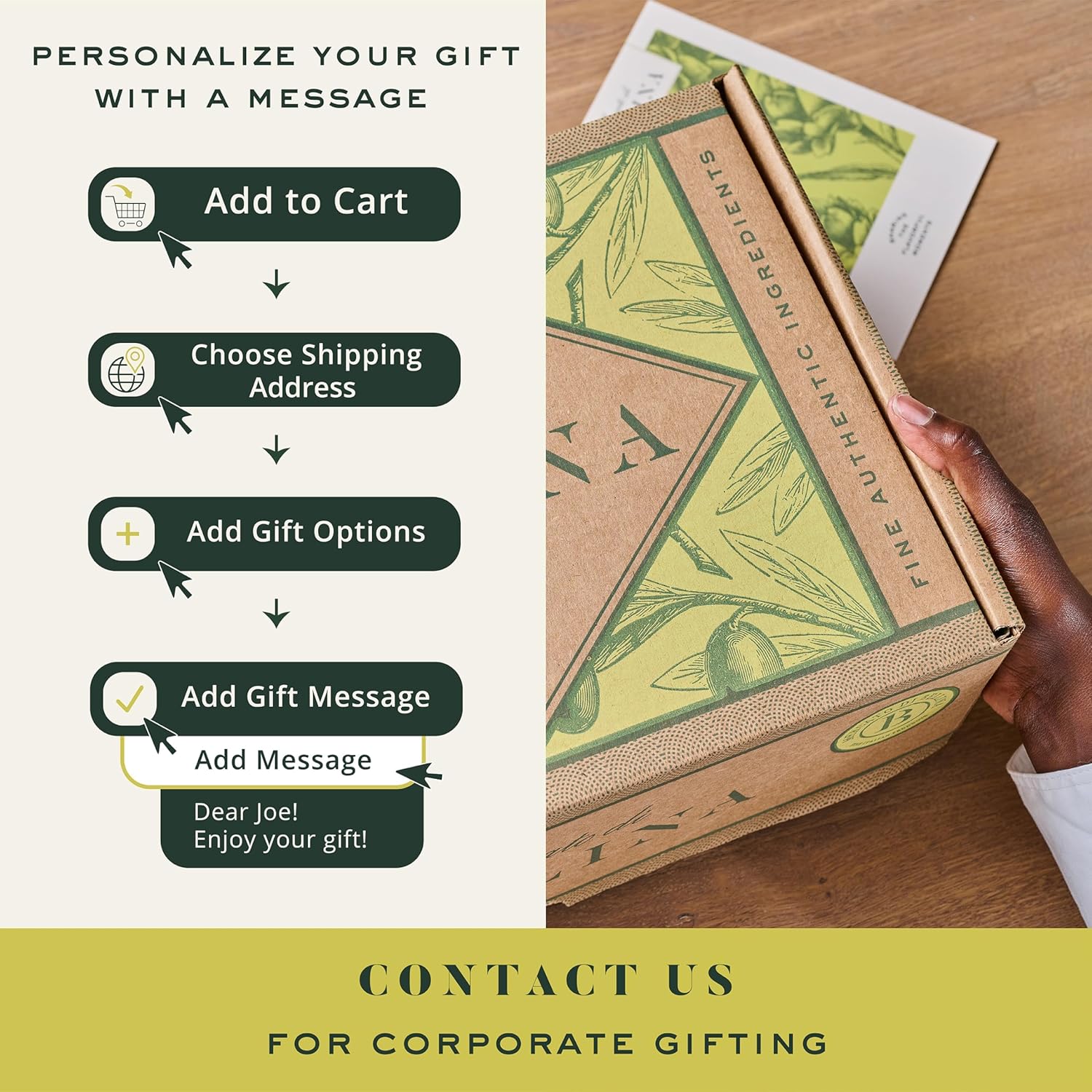 - Personalized Gift Message - Add a personal touch to this Italian food basket with a printed gift message. When ordering - select that you are sending it as a gift and your sentiment can be sent for free with a personalized gift message