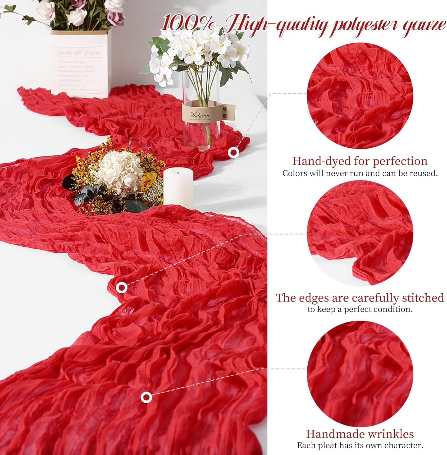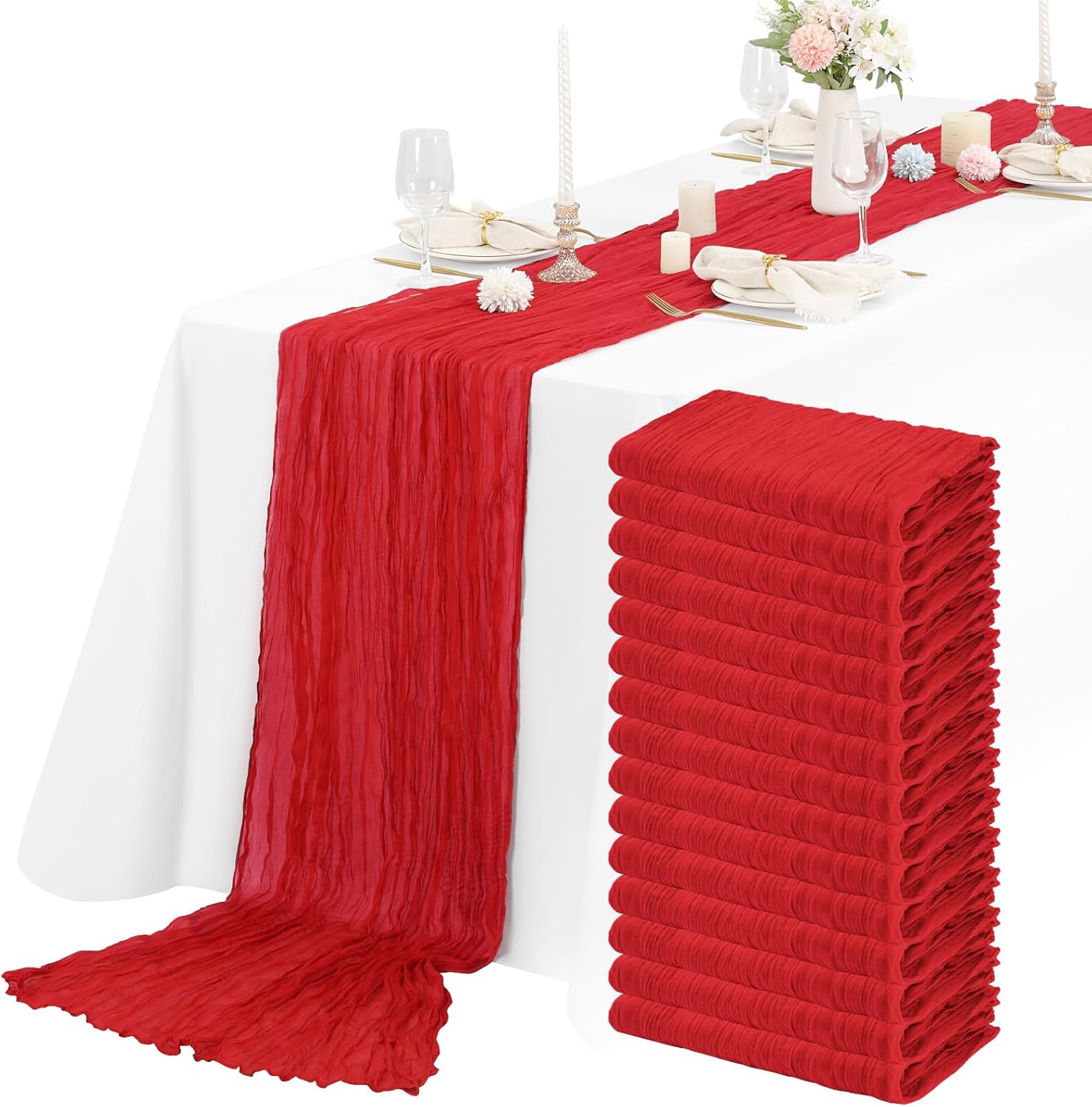 - 【15 PACKS Included, Size & Color】- You will get 15 PACKS Red cotton and linen gauze table runner, with wrinkled, approx.21.5" wide and 10 ft length.Our fall table runners are 120 inches long and Great for both rectangular and round tables or other shaped tables.And They are the Great decoration for wedding arches or tables, chair belts, curtains, fireplaces, cabinets, sofas, etc.