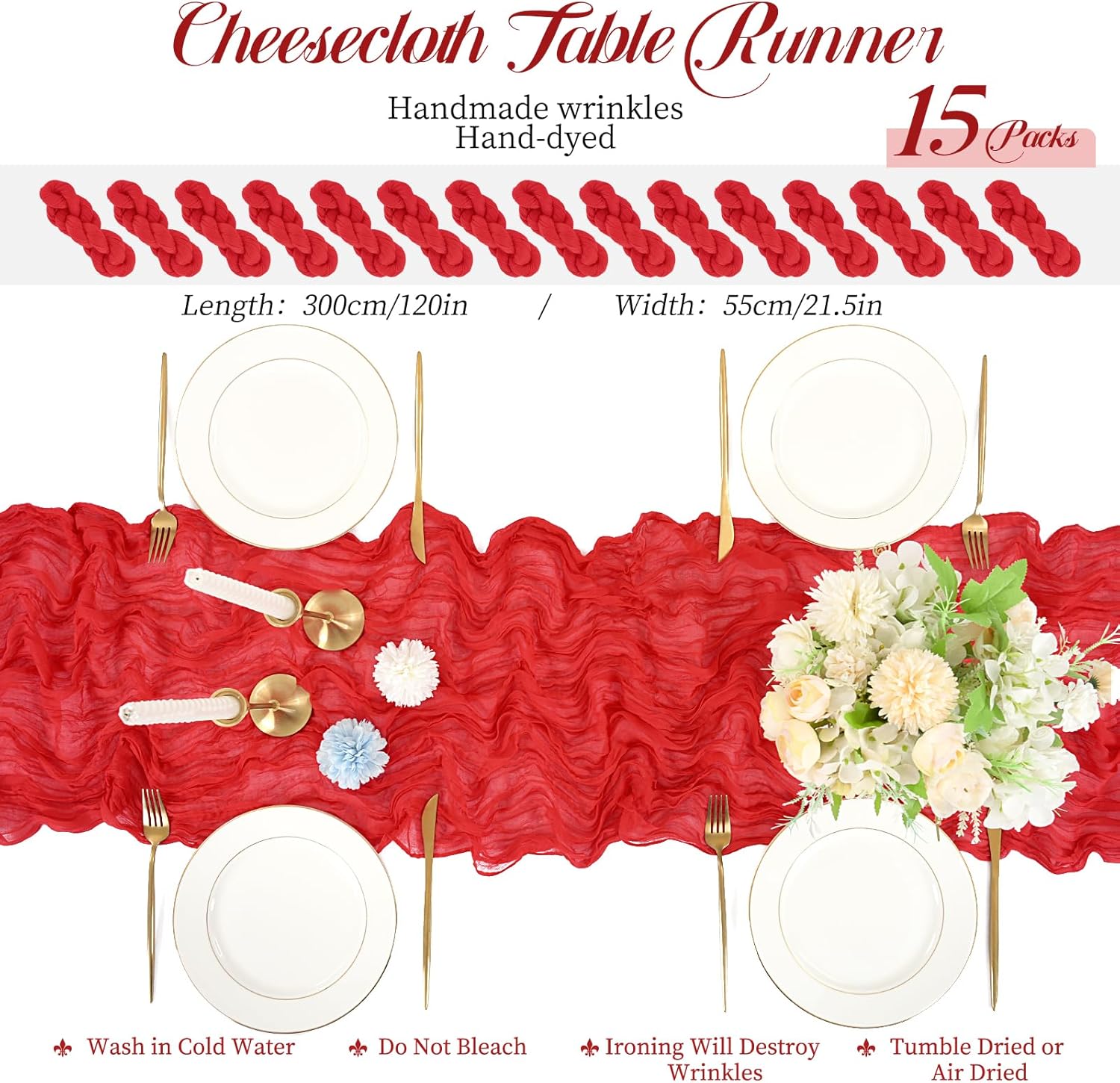 15 Packs Cheesecloth Table Runner Red, 13 Ft Rustic Gauze Boho Wedding Table Runner Decoration, Wedding Table Decor Table Cloth for Wedding Party Bridal Shower Table,21.5x157in