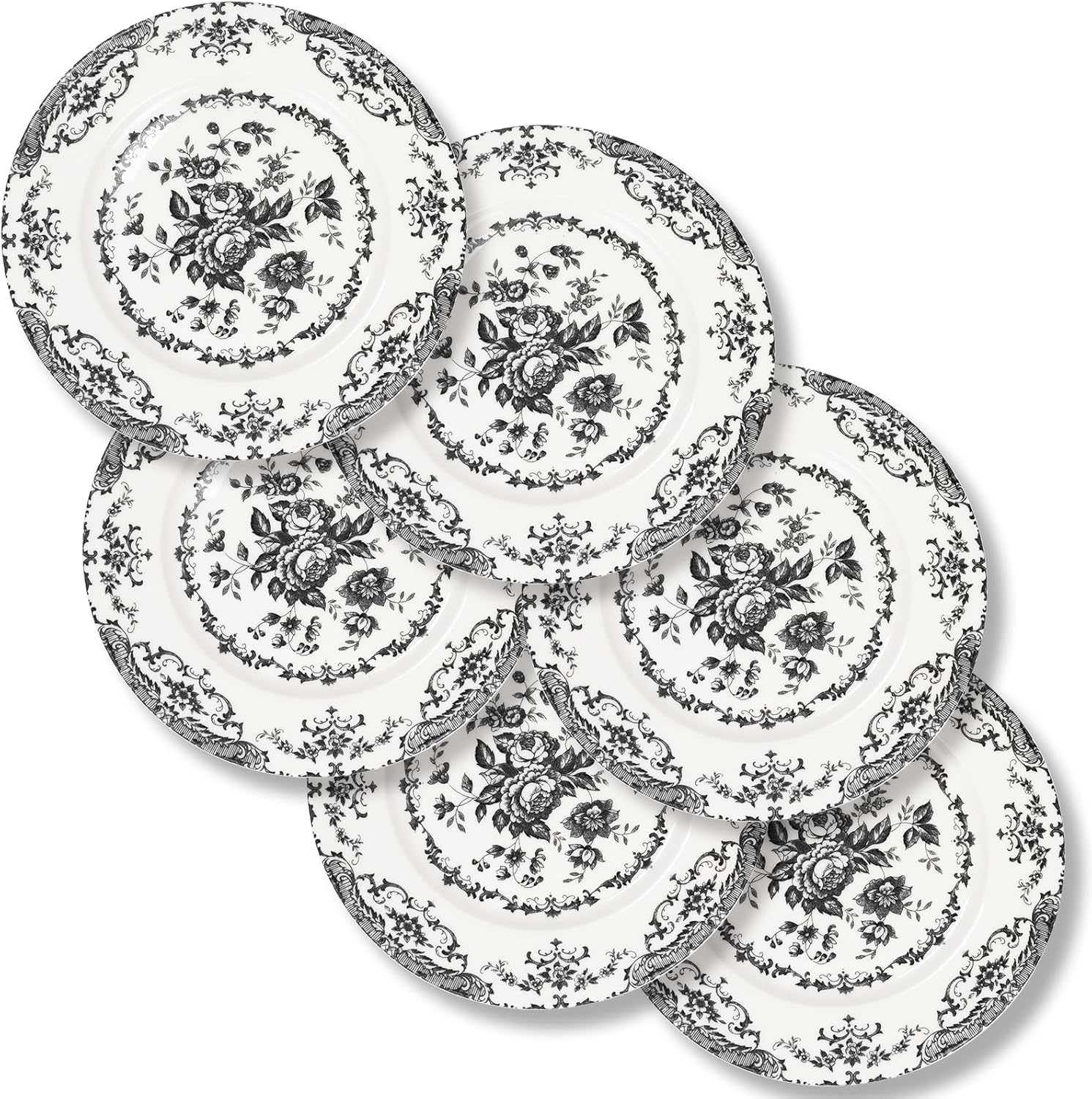 Dinner Plates Set of 6, Ceramic Kitchen Plates Microwave Safe Plates, 10.5 Inch Porcelain Dinner Plates Floral, Black
