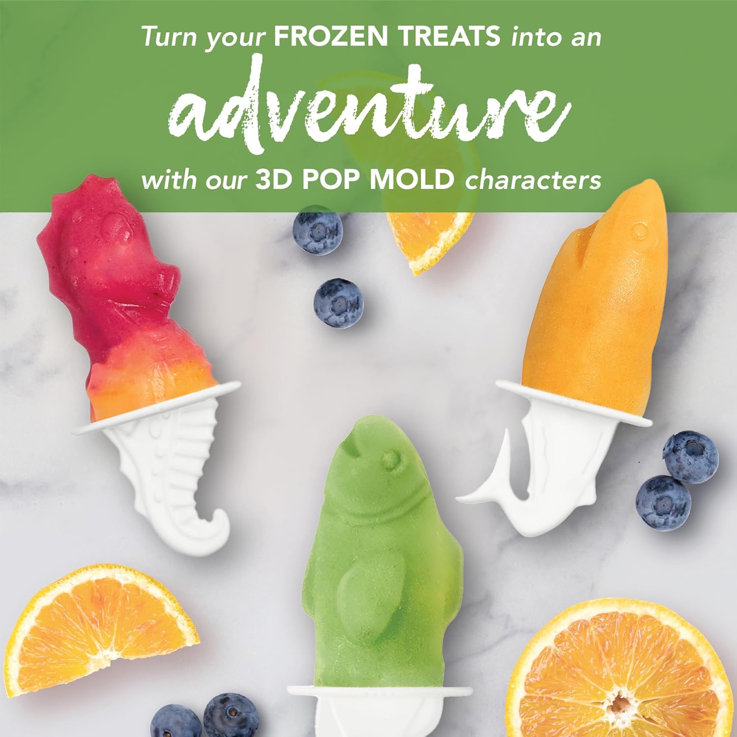 - Enjoy Frozen Pop Treats, Mess-free: Provide delicious and fun treats in a memorable form for kids to enjoy! This set includes one storage base and four unique silicone ocean friend slots: turtle, shark, sea horse and fish, so everyone can choose their favorite! The built-in drip guards and tail-shaped handles are perfect for little hands and lots of fun!